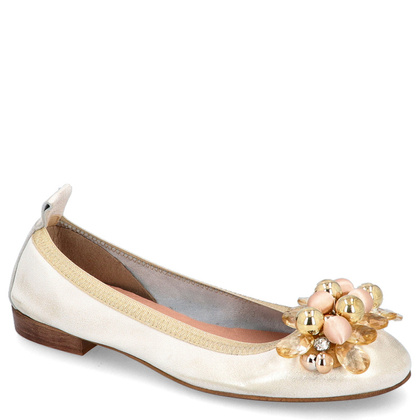Modne baleriny damskie na gumce wykonane z najwyżej jakości skóry naturalnej w delikatnym odcieniu złotego koloru. Ozdobione zostały kryształkami, która nadają im olśniewającego blasku. Baleriny zapewniają najwyższy komfort użytkowania dzięki miękkiej wkładce. W górnej części cholewki została wszyta gumka, która pozwala na wygodne zakładanie i zapewnia idealne dopasowanie obuwia do stopy. Baleriny świetnie wyglądają w połączeniu ze zwiewną suknią, kombinezonem czy spódnicą. Można w nich komfortowo spędzić nawet całą dobę. Przymierz, a poczujesz jak bardzo są wygodne. Odwiedź naszą stronę i zapoznaj się z nowościami.
