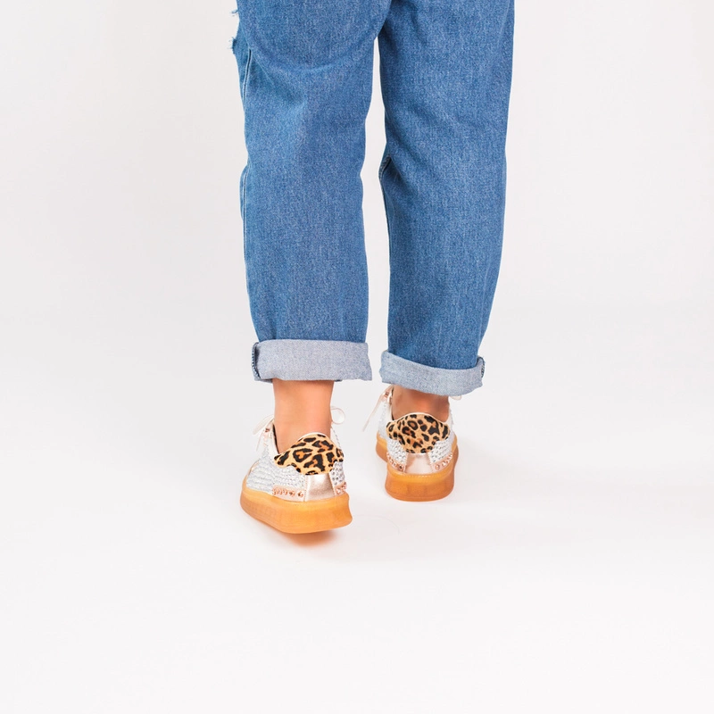 EKP 3929K to wyjątkowe sneakersy dla kobiet, które kochają modę, błysk i wyrazisty styl. Ten model łączy w sobie metaliczny blask różowego złota, błyszczące kryształki oraz modny, zwierzęcy akcent w postaci wstawki w cętki. To buty, które nie pozostaną niezauważone – idealne do miejskich, casualowych stylizacji, którym chcesz dodać charakteru i blasku.