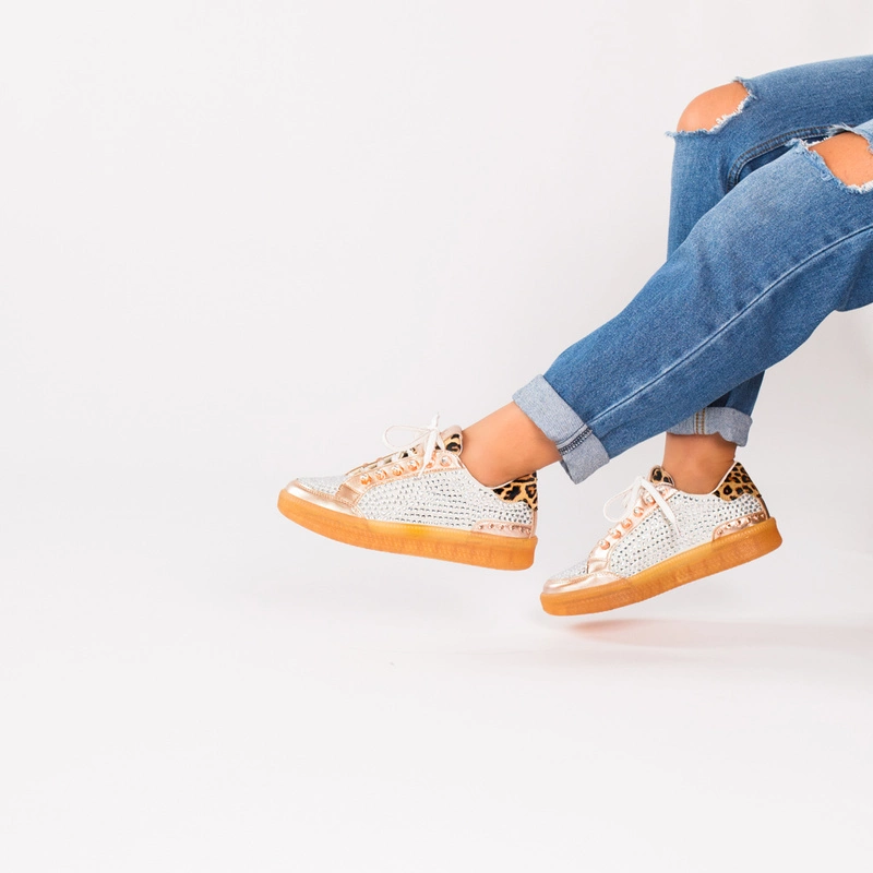 Cholewka wykonana została z połyskującego materiału ozdobionego licznymi drobnymi kryształkami. Metaliczne detale w odcieniu różowego złota oraz różowe nity przy sznurowaniu dodają im wyjątkowego charakteru. Ciekawym akcentem jest język i zapiętek wykończone materiałem w modny wzór panterki.