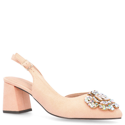 Jeśli cenisz sobie wygodę, a jednocześnie nie chcesz tracić na wyglądzie, to spójrz na nasze najnowsze czółenka z odkrytą piętą, pochodzące od marki MENBUR. Ten model z pewnością Cię zachwyci! Obuwie w pięknym odcieniu beżu za sprawą 7 cm - obcasa typu klocek, są nie tylko efektowne lecz bardzo komfortowe. Nosek uformowany w szpic wraz ze zjawiskowo błyszczącą aplikacją to ideał na wiele okazji! Wyjątkowo zgrabne pantofelki o klasycznym fasonie wykonane z lśniącej tkaniny. Czółenka bez pięty, zapinane na klamerkę, świetnie trzymają się stopy.