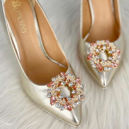 Ozdobne klipsy do butów z kryształkami to bestseller w naszym sklepie! Klipsy pochodzące od marki TYMOTEO LOVE - nasza autorska unikalna kolekcja biżuterii do butów, Klipsy wykonane ręcznie, z miłością i starannością. Niepowtarzalne wzory będą stylowym i eleganckim dodatkiem do klasycznego obuwia. Kształt klipsa w formie okręgu bogato zdobionego lśniącymi, mieniącymi się kryształkami. Klips jest duży i masywny ozdobiony lśniącymi kryształkami w odcieniach beżu z dodatkiem bezbarwnych, całość ozdobiona złotymi gałązkami, na których również lśnią kryształki. Ozdoby mocowane są za pomocą specjalnego klipsa, który bez problemu utrzymuje się na obuwiu, nie odkształca się oraz nie przeszkadza w użytkowaniu. Lubisz błyskotki? Kup już dziś biżuterię do Twoich butów i odmień w nie do poznania!