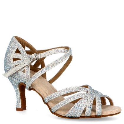 Szukasz wygodnych, a jednocześnie efektownych butów na taneczną imprezę? Sandałki z najnowszej kolekcji TYMOTEO LOVE to profesjonalne taneczne buty! Zgrabne sandałki z miękką elastyczną podeszwą wykończoną od spodu skórą welurową doskonale łączą wygodę i efektowny wygląd. Cholewkę buta opracowano tak, by jak najlepiej trzymała stopę, a paseczki wyłożone opalizującymi cyrkoniami gwarantują błysk na parkiecie. Odkryty przód i zakryta pięta połączone ze skrzyżowanymi paskami to wzór charakterystyczny dla obuwia tanecznego. Buty są wyjątkowo wygodne i doskonale sprawdzą się podczas wielogodzinnej zabawy na parkiecie lub treningach tańca latynoskiego. W sandałkach zastosowano sprawdzony obcas o wysokości 7,5 cm, szpilka latynoska typu flare dodaje sylwetce lekkości, a przy tym jest bardzo stabilna. Paski trzymające stopę ułożone są krzyżowo, dzięki temu but nie skraca nogi, a wręcz przeciwnie, podkreśla jej zgrabną linię i dodaje butom wdzięku. Wnętrze buta także zostało wykonane z miękkiego materiału, zapewnia więc doskonałą cyrkulację powietrza.