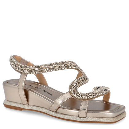 Cenisz sobie komfort oraz wygodę, ale wizualny aspekt jest dla Ciebie równie ważny? Jeśli tak to pochodzące z naszej najnowszej kolekcji sandały ALMA EN PENA będą dla Ciebie odpowiednie! Sandały zostały wykonane z najwyższej jakości naturalnej skóry licowej w pięknym odcieniu starego złota . Pasek z przodu wysadzany mieniącymi się kryształkami doskonale podtrzymuje stopę. Ten stylowy motyw został pociągnięty w kierunku górnej części, tworząc tym samym wzór węża- niesamowicie efektowny zabieg! Solidne zapięcie z wykorzystaniem uniwersalnej i ponadczasowej sprzączki sprawia, że bez trudu dopasujesz buty do szerokości stopy.