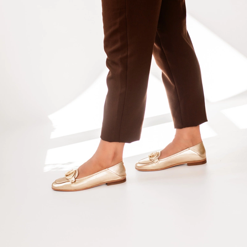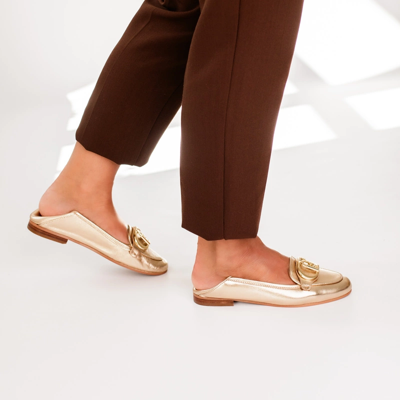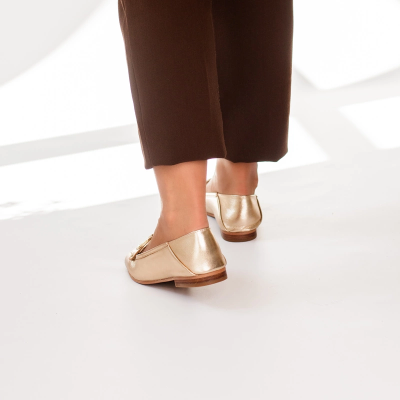 Metaliczne wykończenie w złocie nadaje półbutom wyjątkowego uroku i sprawia, że są one czymś więcej niż tylko klasycznym obuwiem. To model, który pięknie komponuje się zarówno z prostymi, stonowanymi ubraniami, jak i bardziej odważnymi zestawami. Grubsza podeszwa podkreśla nowoczesny charakter i zapewnia wygodę, a subtelne detale dodają całości luksusowego wyglądu.