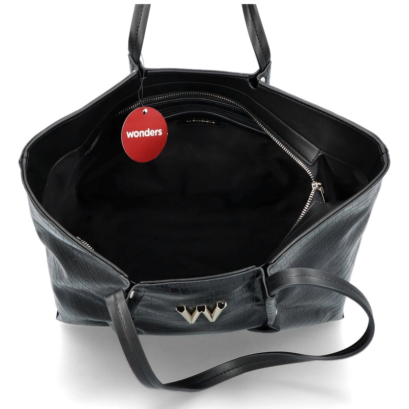 Czarna shopperka Wonders WB-54023 to idealny wybór dla kobiet, które cenią funkcjonalność i chcą wyróżniać się unikalnym stylem. Wyróżniająca się tłoczona faktura inspirowana motywem zwierzęcym dodaje charakteru i wpisuje się w najmodniejsze trendy sezonu. Torebka łączy w sobie klasyczną kolorystykę z wyrazistym detalem – dzięki temu sprawdzi się zarówno w biurze, jak i w miejskich stylizacjach.