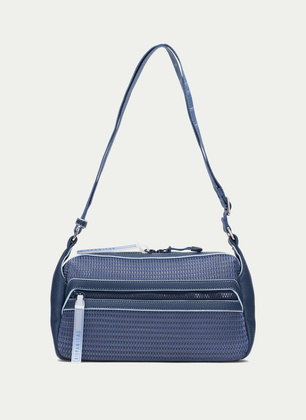 Ciemnoniebieska kolorystyka nadaje torebce ponadczasowego charakteru i sprawia, że jest ona łatwa do zestawienia z wieloma elementami garderoby. Strukturalny front dodaje całości nowoczesnego wyglądu, a jasne lamówki i detale przy zamkach subtelnie podkreślają linię torebki, przełamując jednolitą barwę.