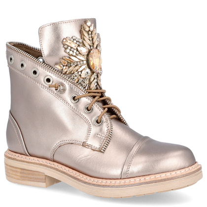 Hiszpańskie botki premium pochodzą od najnowszej kolekcji wyjątkowej marki Alma en Pena, której buty zachwycają starannym wykonaniem oraz efektownymi zdobieniami. Niezwykle olśniewające buty na grubej podeszwie, wykonane z mięciutkiej naturalnej skóry licowej w wyrazistym złotym kolorze zagwarantują Ci komfort podczas użytkowania. Zjawiskowe kryształki umieszczone na przodzie buta budzą zainteresowanie. Wnętrze obuwia wykończone zostało tkaniną ocieplającą, idealną podczas chłodniejszych dni. Dodatkowym zaletą ułatwiającą użytkowanie obuwia jest zastosowany system wiązania.