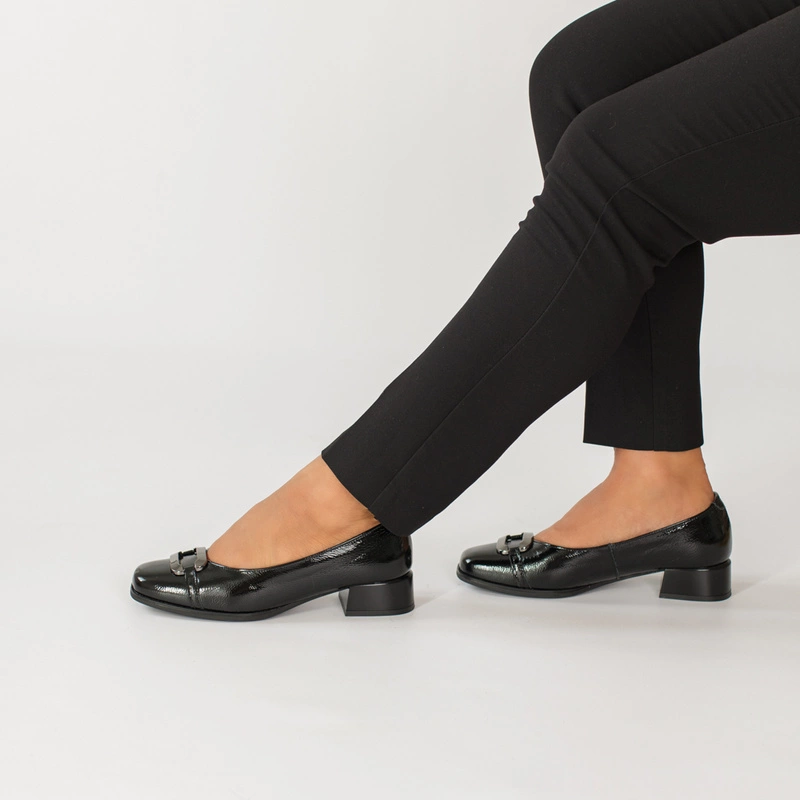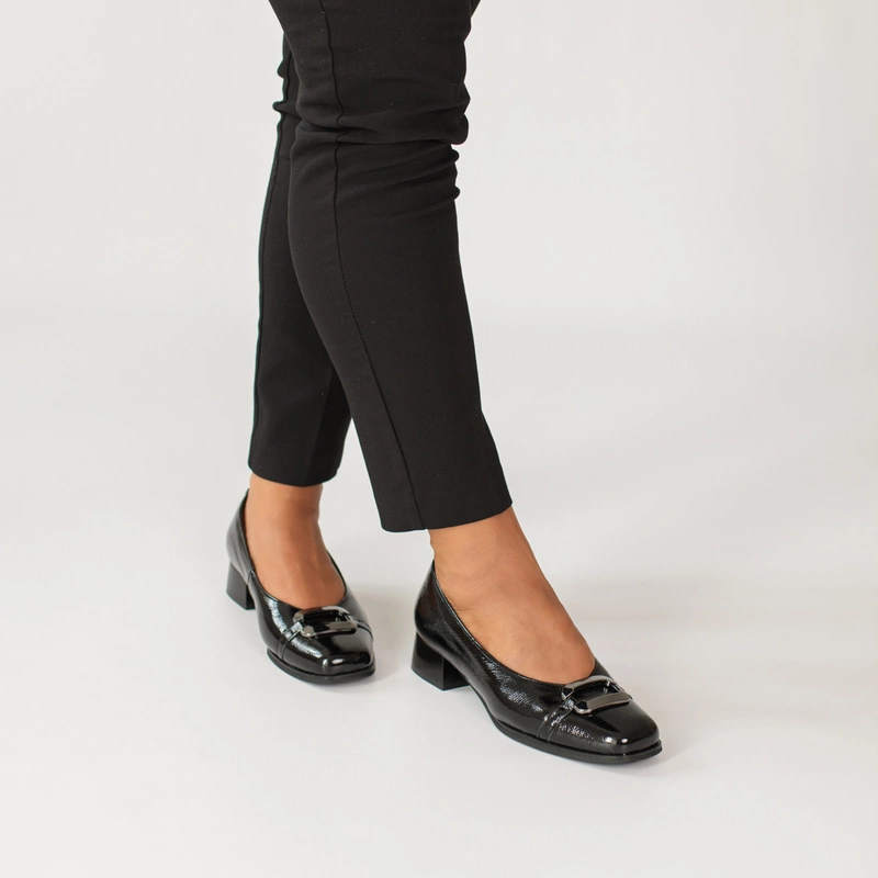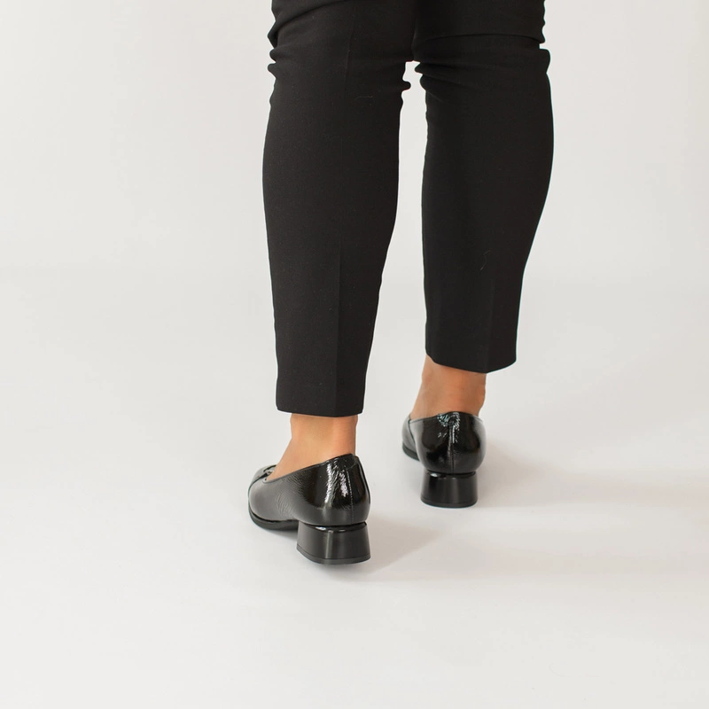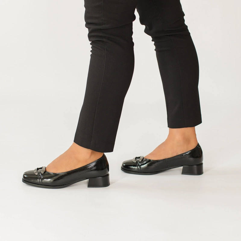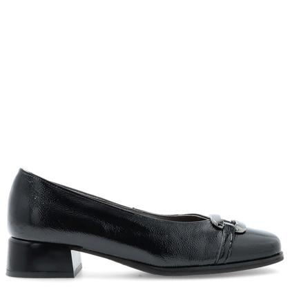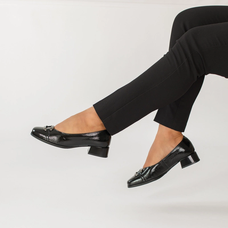 Czarne czółenka PITILLOS 10812 to kwintesencja klasy i komfortu, idealna dla kobiet, które poszukują eleganckiego obuwia do codziennego użytku i na wyjątkowe okazje. Wykonane z wysokiej jakości skóry naturalnej lakierowanej, zachwycają subtelnym połyskiem i starannym wykończeniem. Niski, stabilny obcas zapewnia wygodę przez cały dzień, a delikatna ozdoba na nosku dodaje butom wyjątkowego charakteru.