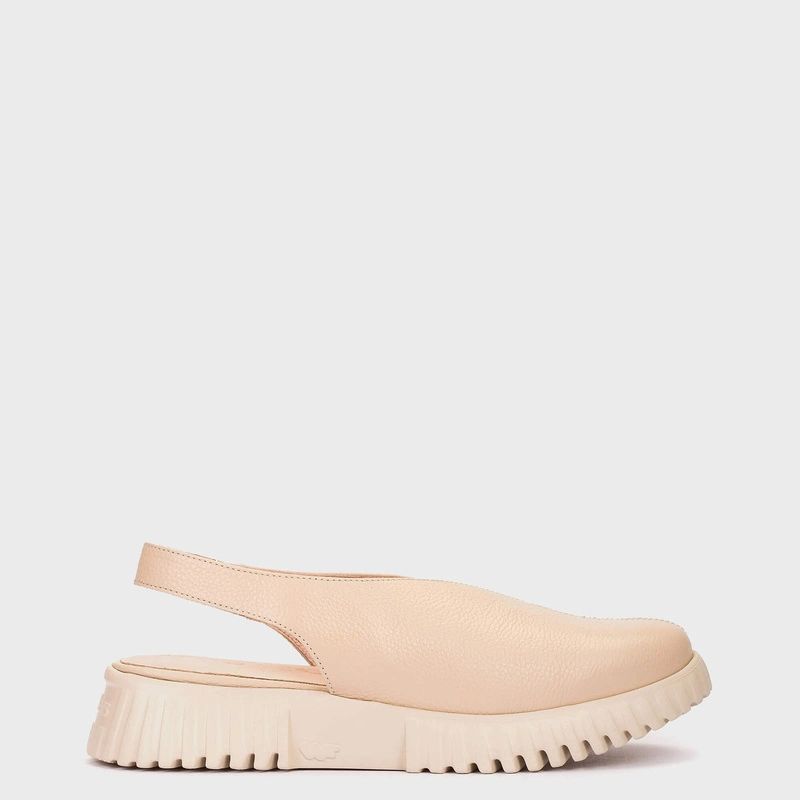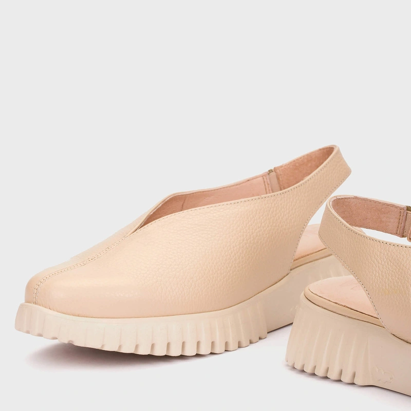 Beżowa kolorystyka i nowoczesna forma półbutów bez pięty