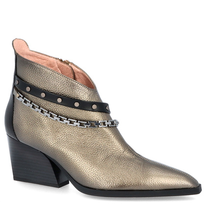 Metaliczne botki wykonane przez hiszpańską firmę HISPANITAS to kolejna propozycja na nadchodzący wielkimi krokami sezon jesienny. Buty wykonane z najwyższej skóry naturalnej licowej. Główną ozdobą jest łańcuszek usytuowany na przedniej i zewnętrznej stronie buta, który ułatwia zakładanie oraz zdejmowanie. Botki posiadają 6,5-centymetrowy, szeroki obcas, dzięki czemu są stabilne. Miękka wyściółka wyposażona została w system TRIFLOW, czyli potrójną amortyzację z wykorzystaniem specjalnej pianki oraz żelu.