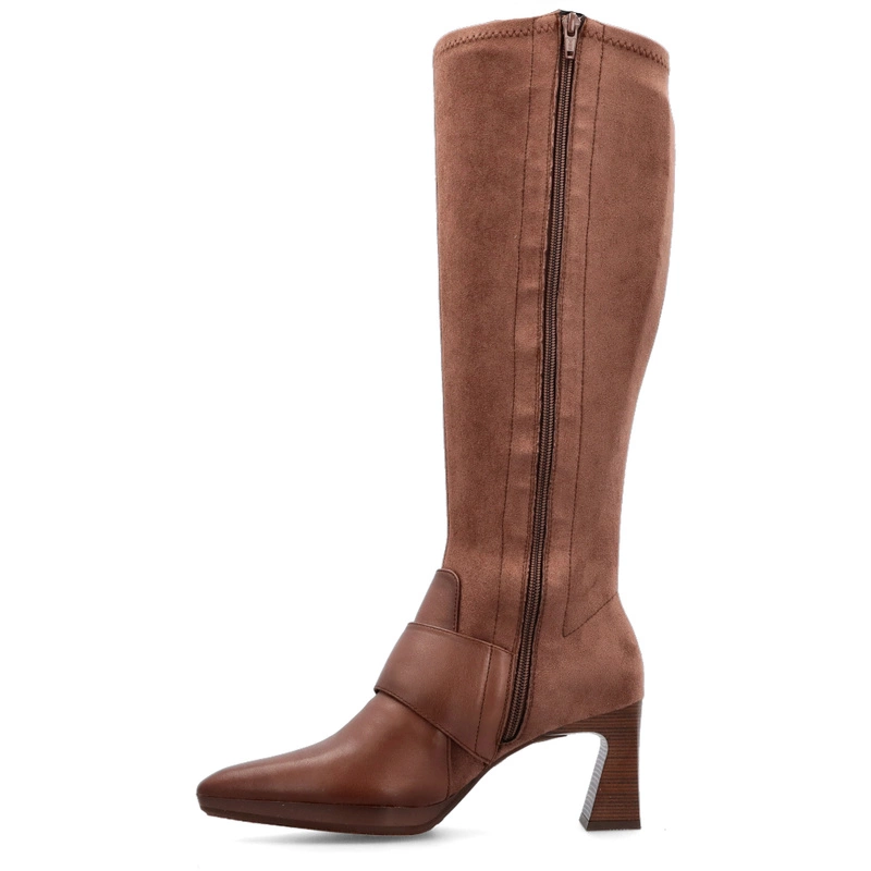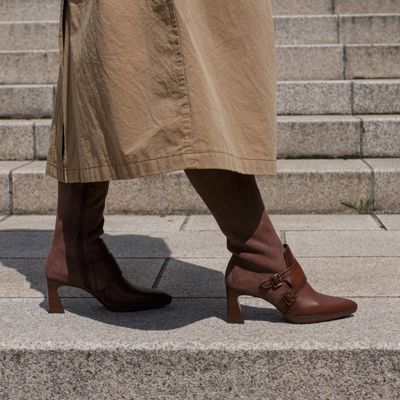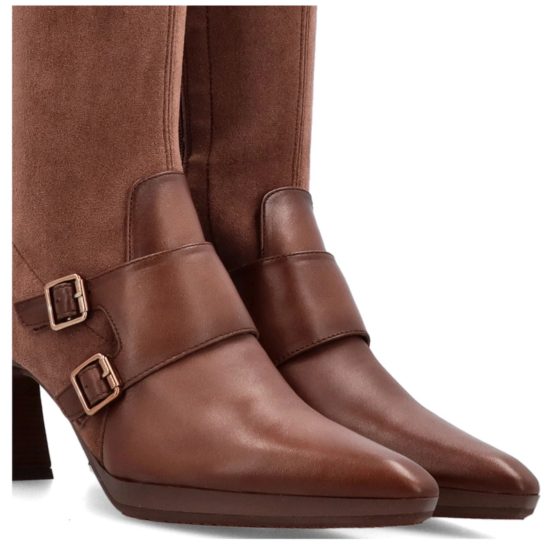 Brązowa kolorystyka nadaje kozakom ponadczasowego charakteru, który doskonale komponuje się z jesienno-zimową garderobą. Cholewka została wykonana z wysokiej jakości skóry naturalnej połączonej z materiałem tekstylnym – to połączenie gwarantuje trwałość, estetykę i przyjemność noszenia. Wewnątrz znajduje się miękka wyściółka, która zapewnia komfort nawet przy długotrwałym użytkowaniu.