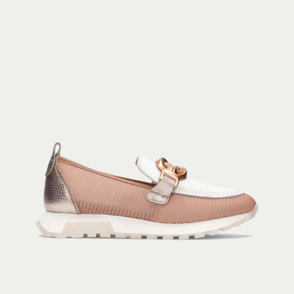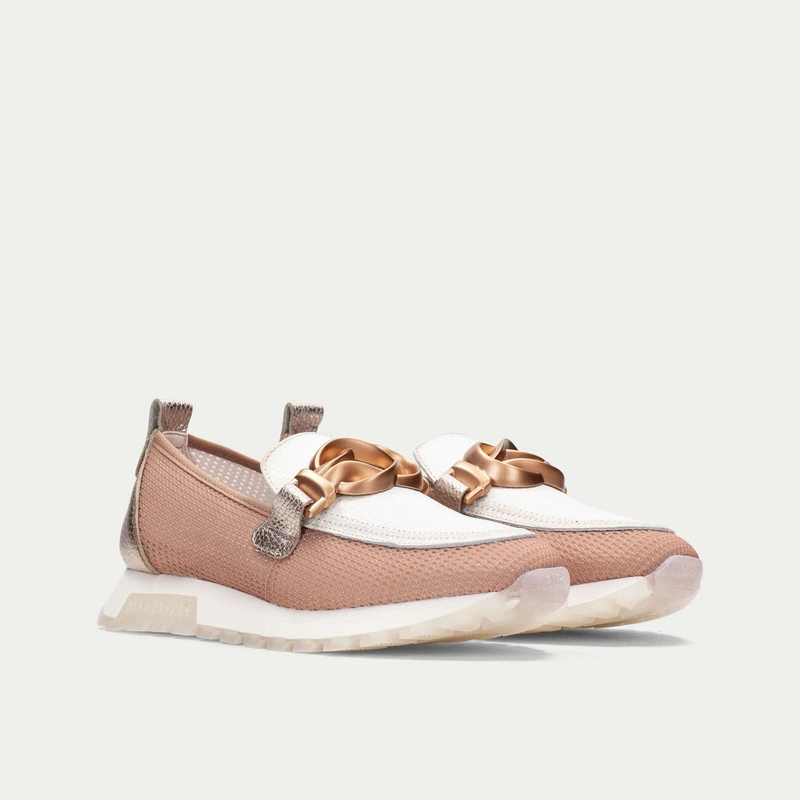 Cholewka została wykonana z wysokiej jakości materiałów, łącząc gładkie jasne wykończenia z delikatną, przewiewną strukturą po bokach. Wsuwany fason zapewnia wygodę użytkowania, a efektowna klamra w ciepłym, metalicznym odcieniu stanowi elegancki akcent, który przyciąga uwagę i podkreśla kobiecy styl.