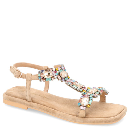 Jeśli poszukujesz butów o wyszukanym wzornictwie, to te niesamowicie efektowne sandały z pewnością skradną Twoją uwagę! Stylowe sandały na płaskim spodzie marki Alma En Pena to nowość w naszej ofercie. Obuwie zostało wykonane z wysokiej jakości naturalnej skóry zamszowej w klasycznym odcieniu beżu. Przedni pasek pnący się ku górze wysadzany mieniącymi się na kolorowo kryształami dobrze trzyma stopę, gwarantując stabilność. Solidne zapięcie wokół kostki z wykorzystaniem uniwersalnej i ponadczasowej sprzączki, sprawia, że bez trudu dopasujesz buty do szerokości stopy. Sandały posiadają 2 - centymetrowy spód, gwarantujący prawidłowe ułożenie stopy.
