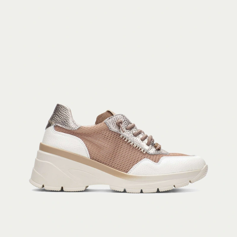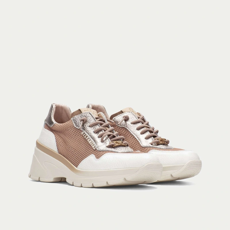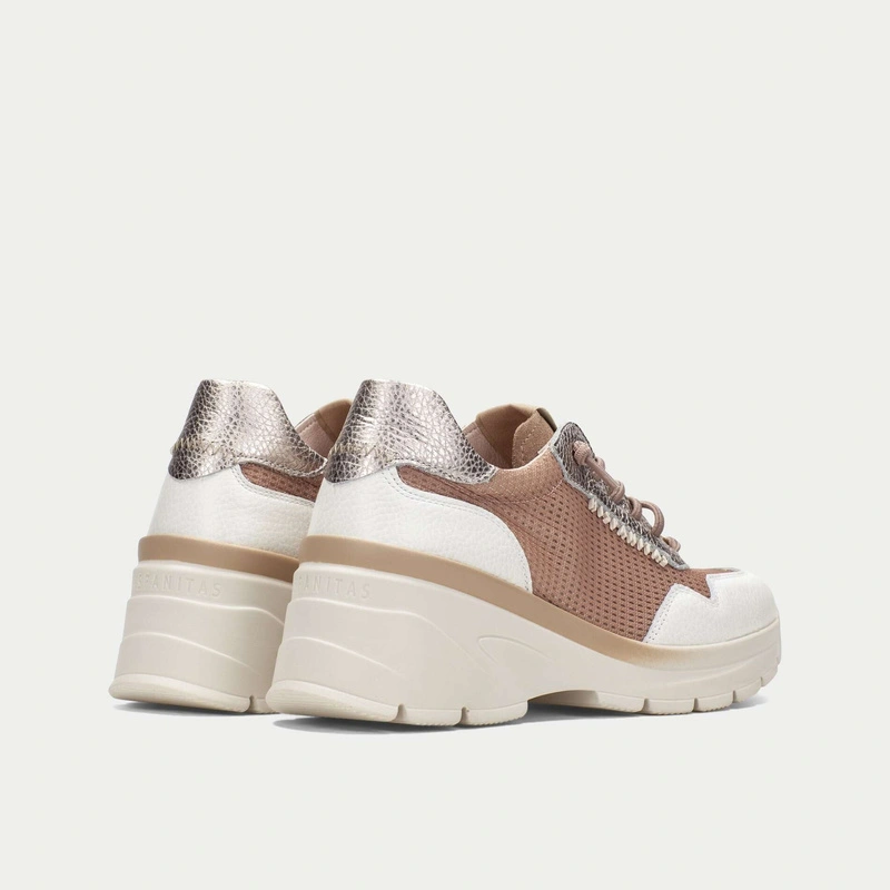 Beżowe sneakersy Hispanitas CHV264712 to model z linii premium, który łączy nowoczesny, sportowy charakter z eleganckimi detalami. Uwagę przyciąga przewiewna struktura materiału w ciepłym beżowym odcieniu, zestawiona z jasnymi panelami oraz subtelnymi, metalizowanymi akcentami. To propozycja dla kobiet, które szukają wygodnych sneakersów o dopracowanym wyglądzie.