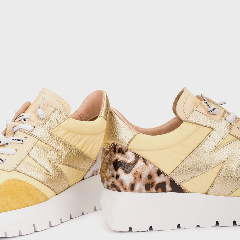 Hiszpańskie sneakersy premium Wonders A-24100 – waniliowy odcień żółci z panterkowym akcentem