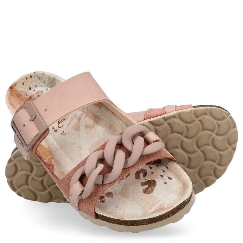 Cholewka klapek została wykonana z wysokiej jakości skóry naturalnej, która jest miękka, trwała i przyjazna dla skóry. Szeroki pasek z klamrą umożliwia indywidualne dopasowanie do stopy, a ozdobny łańcuch w tonacji nude dodaje całości wyrafinowanego uroku.