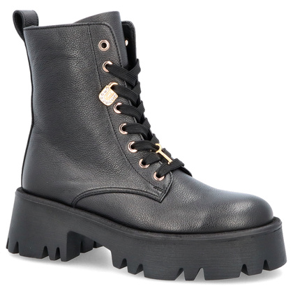 Klasyczne workery z kolekcji polskiej marki KARINO. Wykonane z wysokiej jakości naturalnej skóry licowej w uniwersalnym czarnym odcieniu - trwałej skóry zapewniającej solidność. Miękka, skórzana wkładka sprawi, że będziesz czuć się komfortowo podczas codziennego użytkowania. Buty tej produkcji charakteryzują zdobne detale przykuwające uwagę. Najciekawszym elementem w tym modelu buta jest ozdoba w przedniej jego części w postaci kłódki i klucza. Przód buta jest sznurowany lecz po wewnętrznej stronie obuwia znajduję się praktyczny zamek, który zdecydowanie ułatwia ich zakładanie oraz zdejmowanie. Cholewka zestawiona jest z grubą oraz stabilną podeszwą wykonaną z wysokogatunkowego tworzywa, wyróżnia się stabilnością oraz odpornością na złe warunki atmosferyczne.