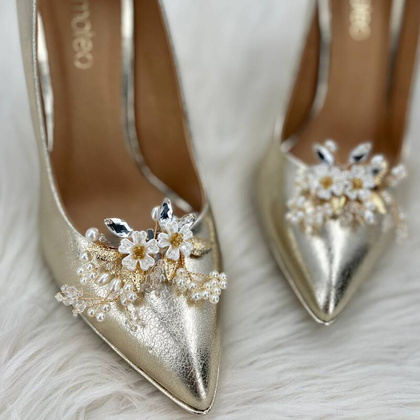 Ozdobne klipsy do butów z kryształkami to nowość w naszym sklepie! Klipsy pochodzące od marki TYMOTEO LOVE - nasza autorska unikalna kolekcja biżuterii do butów, Klipsy wykonane ręcznie, z miłością i starannością. Niepowtarzalne wzory będą stylowym i eleganckim dodatkiem do klasycznego obuwia. Kształt klipsa w formie perłowych kwiatuszków, złotych oraz kryształowych listków, bogato zdobionego lśniącymi, mieniącymi się w świetle kryształami. Klipsy są duże, w całości wykonane z kryształków na elastycznej złotej bazie, dzięki czemu można je dowolnie formować. Jest to błyszczący, a zarazem elegancki motyw. Ozdoby mocowane są za pomocą specjalnego klipsa, który bez problemu utrzymuje się na obuwiu, nie odkształca się oraz nie przeszkadza w użytkowaniu. Lubisz błyskotki? Kup już dziś biżuterię do Twoich butów i odmień w nie do poznania!