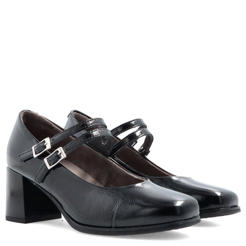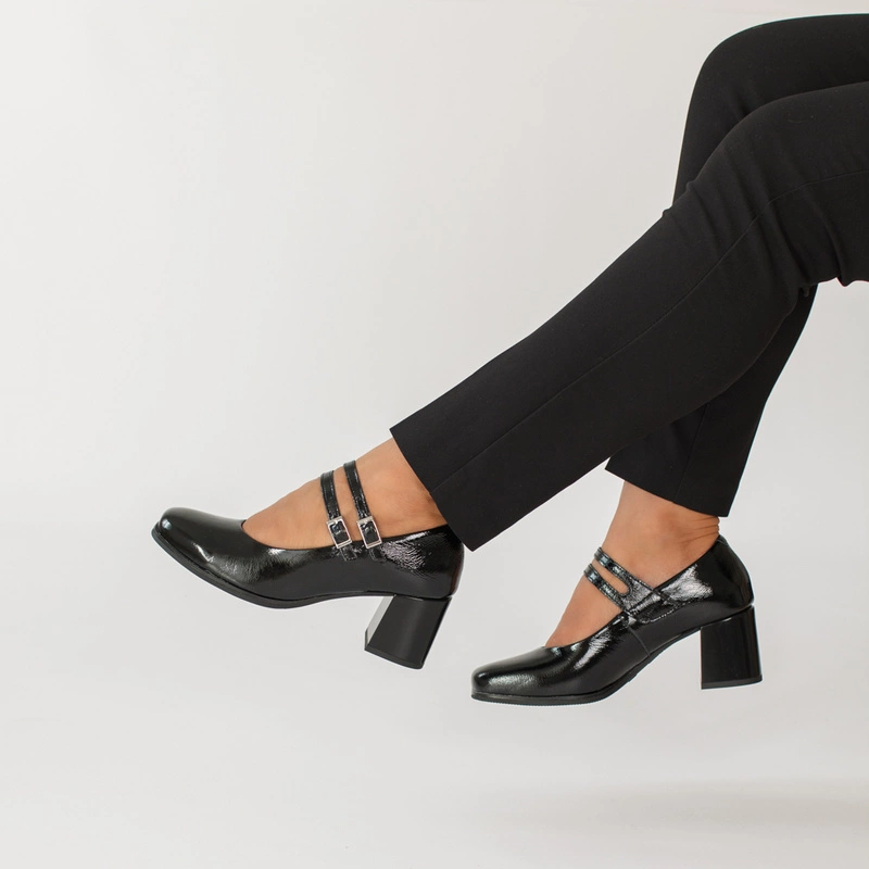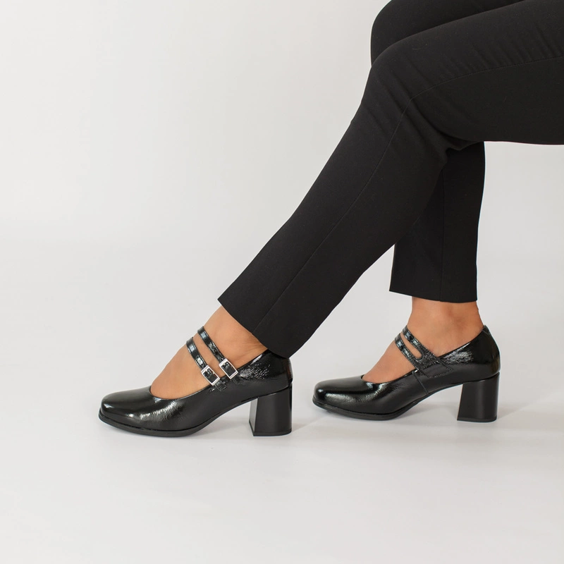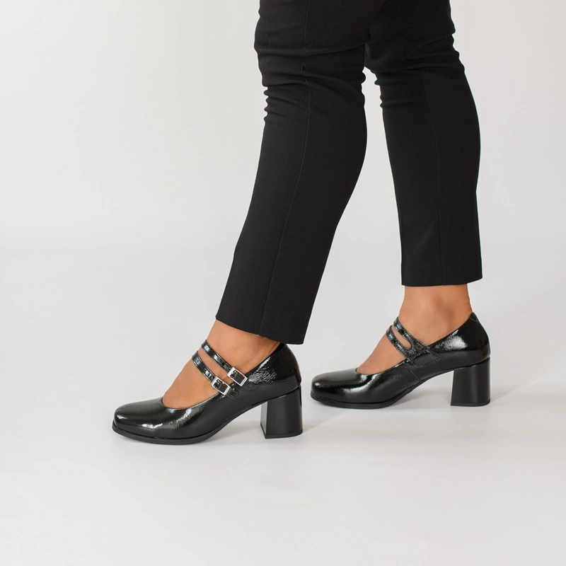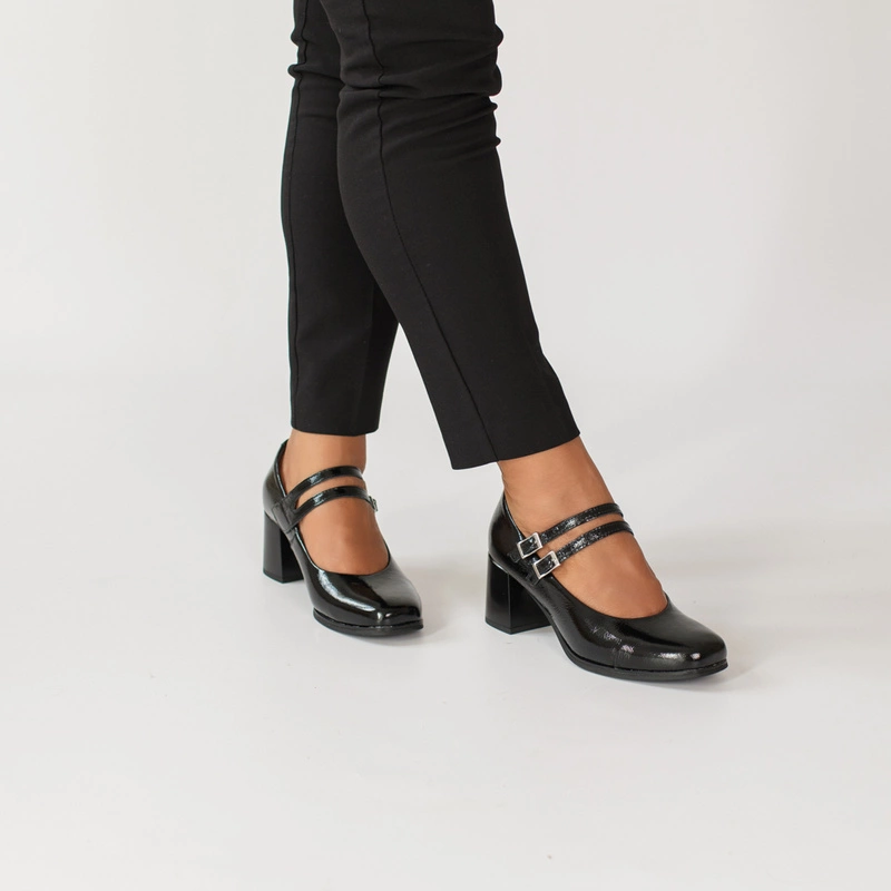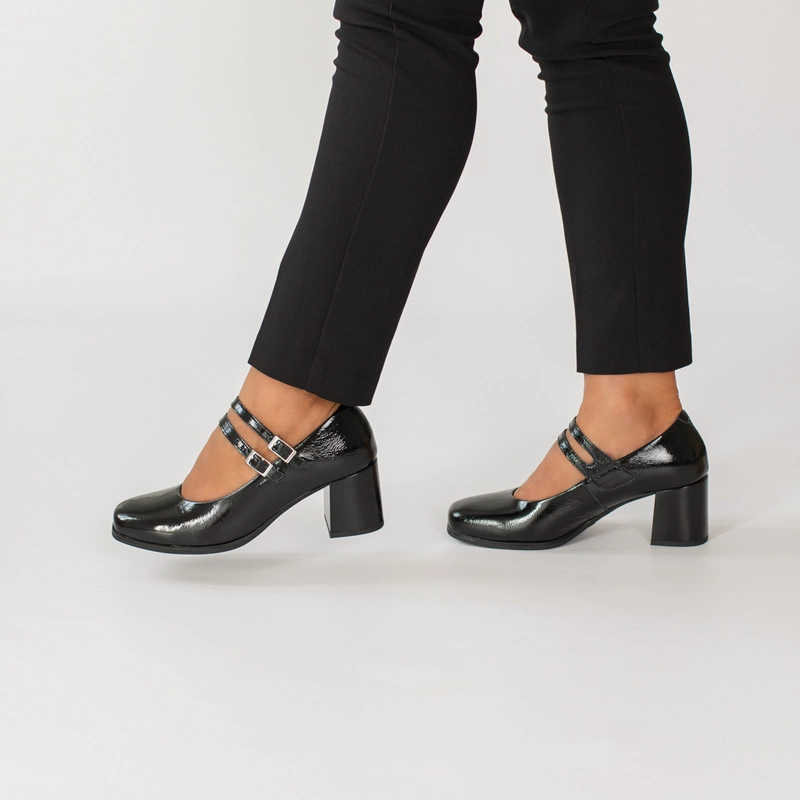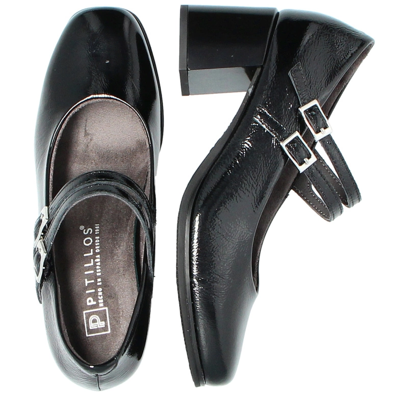 Czarne czółenka PITILLOS 10831 to połączenie elegancji i subtelnego stylu retro. Wykonane z wysokiej jakości skóry naturalnej lakierowanej, zachwycają delikatnym połyskiem i perfekcyjnym wykończeniem. Charakterystyczne dwa cienkie paseczki z klamerkami nie tylko pięknie zdobią, ale także stabilizują stopę, zapewniając pewny krok. Stabilny, szeroki obcas gwarantuje wygodę nawet podczas całodziennego noszenia.