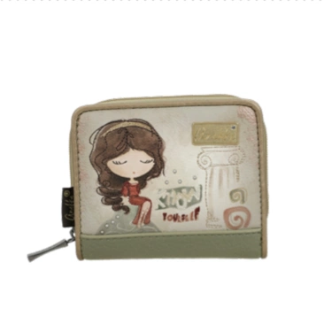 Front portmonetki zdobi grafika Anekke w greckiej scenerii – pośród kolumn, złotych refleksów i błękitu morza. Subtelne hafty, metaliczne logo i zawieszka w kształcie liścia laurowego – symbolizującego mądrość i kobiecą siłę – nadają jej wyjątkowego charakteru. Jasna kolorystyka inspirowana greckim światłem sprawia, że model emanuje spokojem, elegancją i lekkością.