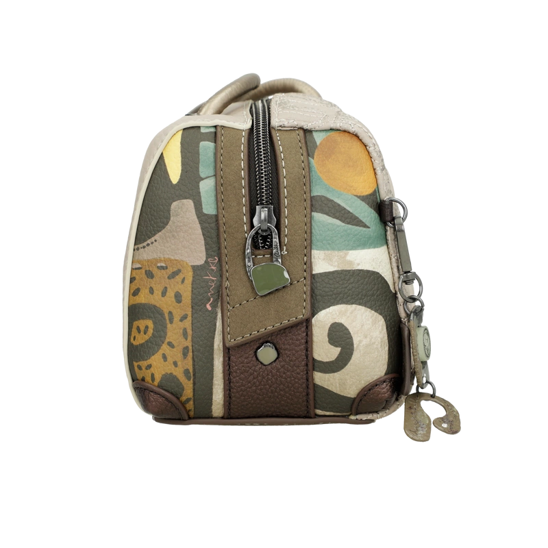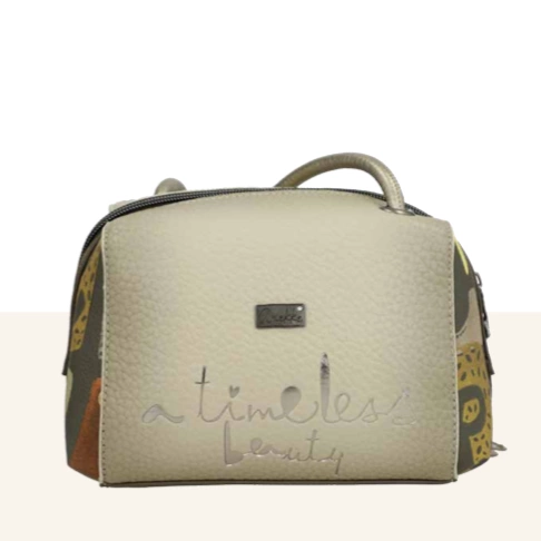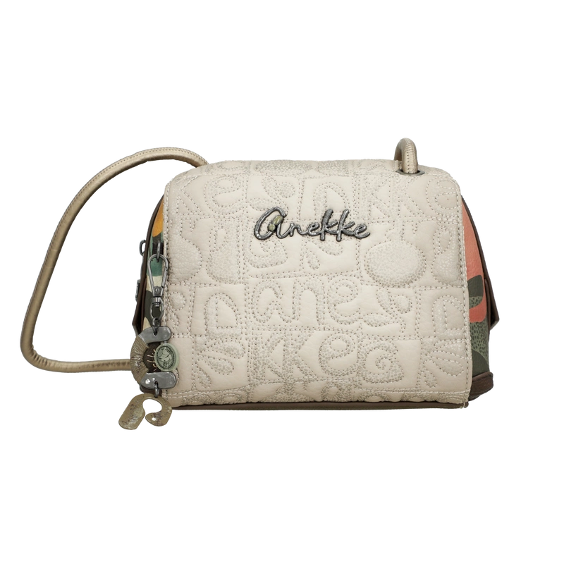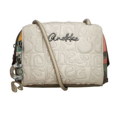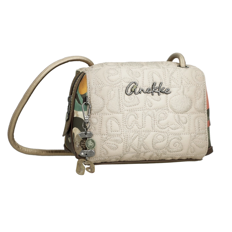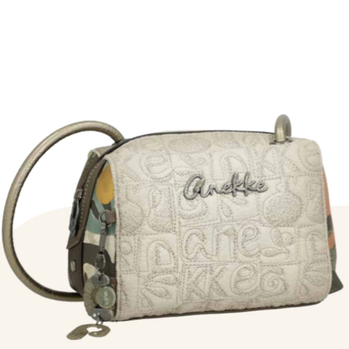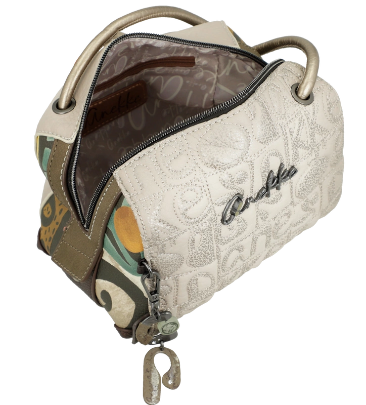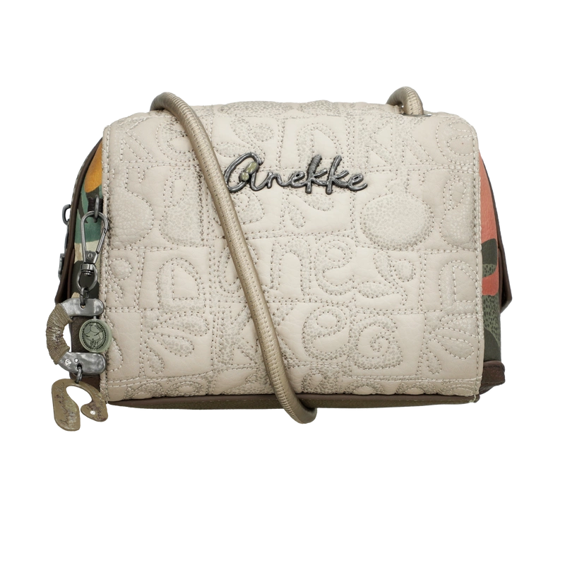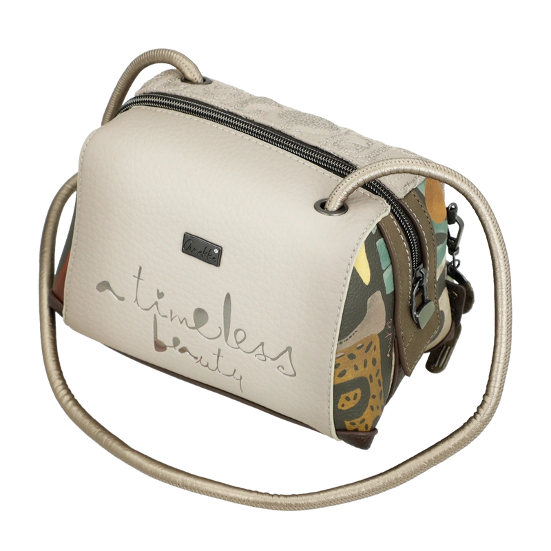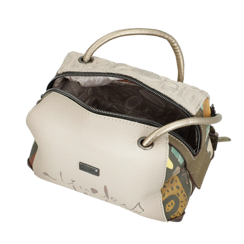 Front torebki zdobi grafika Anekke inspirowana grecką ceramiką – w harmonijnych odcieniach beżu, błękitu i ochry, z delikatnymi haftami i złotymi refleksami. Uroku dodaje charakterystyczna zawieszka w kształcie amfory, symbolizująca kobiecą siłę i piękno, które rodzi się z wnętrza. Subtelne detale i ciepła kolorystyka nadają jej artystycznego charakteru.