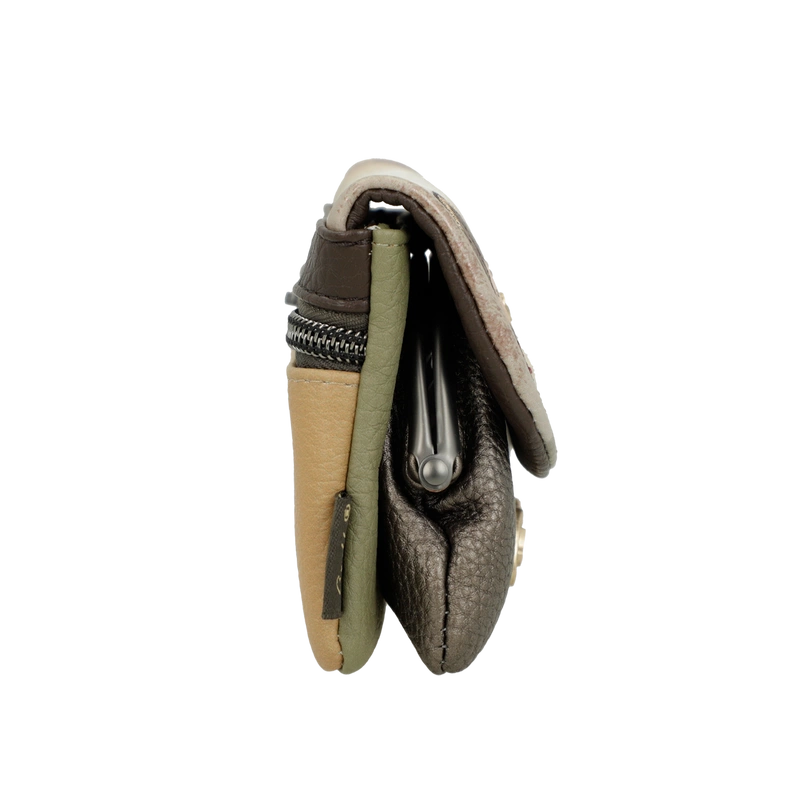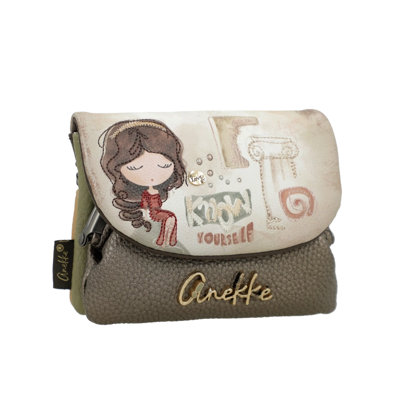 Front portfela zdobi grafika Anekke w antycznej scenerii – w otoczeniu błękitów, beżów i złocistych refleksów słońca. Ozdobne hafty, metaliczne logo i zawieszka w formie liścia laurowego – symbolizującego mądrość i kobiecą siłę – podkreślają wyjątkowy charakter projektu. Delikatna kolorystyka inspirowana śródziemnomorskim światłem sprawia, że portfel jest nie tylko praktyczny, ale i niezwykle elegancki.