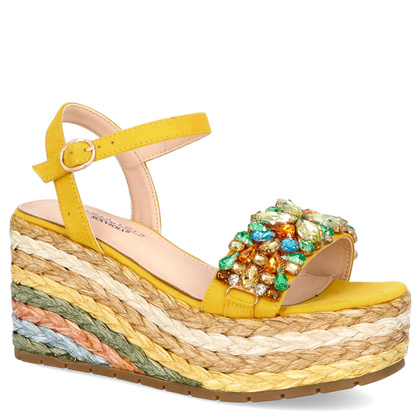 Cenisz sobie komfort oraz wygodę, ale nie zapominasz, że unikatowość jest dla Ciebie równie ważna? Jeśli tak to pochodzące z naszej najnowszej kolekcji sandałki na koturnie SCAVIOLA będą dla Ciebie doskonałym wyborem! Sandały zostały wykonane z najwyższej jakości materiałów w niebanalnej żółtej kolorystyce. Szeroki pasek z przodu, doskonale podtrzymujący stopę - przyozdobiony został nietuzinkową oraz oryginalną aplikacją z kolorowych diamencików o różnej wielkości, które dodają beztroskiego i oryginalnego wyglądu. Solidne zapięcie wokół kostki z wykorzystaniem uniwersalnej i ponadczasowej sprzączki zapewnia doskonałą stabilność oraz dopasowanie. Stabilny 9 - centymetrowy obcas typu koturn dodaje kilku centymetrów wzrostu, optycznie wysmukla i wydłuża sylwetkę, nadając jej niebywałej lekkości i kobiecego wdzięku.