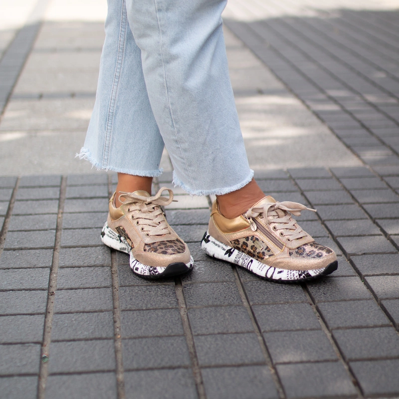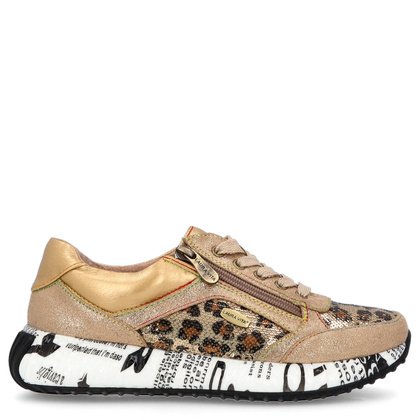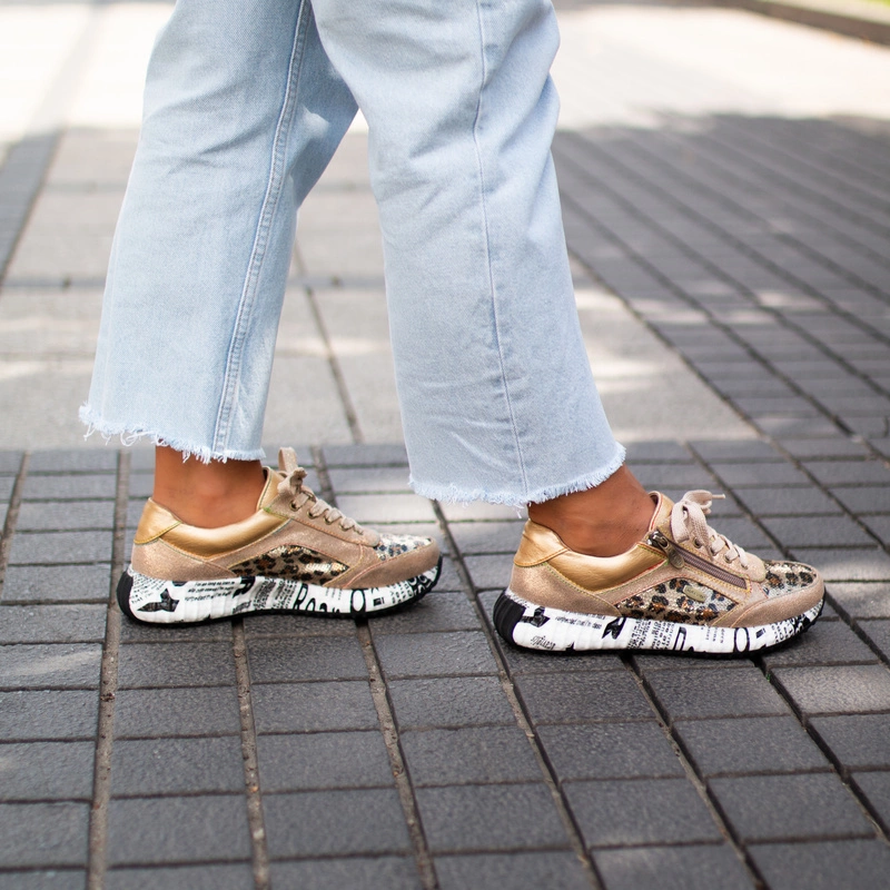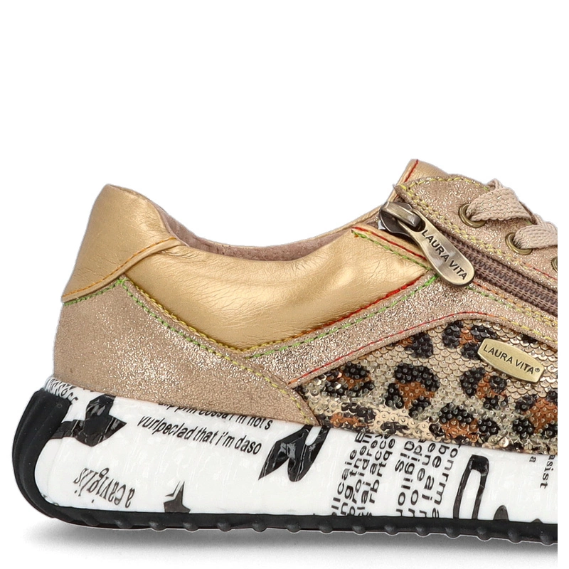 Jeśli szukasz obuwia, które łączy w sobie modny wygląd, komfort noszenia i najwyższą jakość wykonania, sneakersy LAURA VITA BURTON 11 w złotej odsłonie to idealny wybór. Ten model przyciąga wzrok wyjątkową kolorystyką i bogactwem detali – od metalizowanej skóry, przez cekinowe zdobienia w motyw panterki, aż po unikalną podeszwę z nadrukiem w stylu street-art.