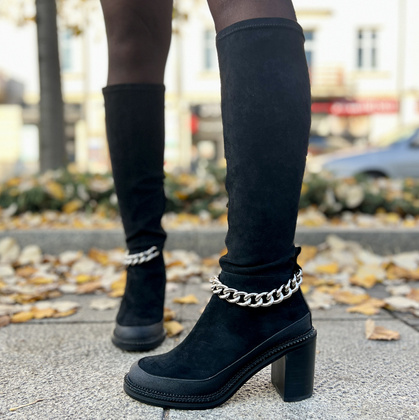 Modne zamszowe kozaki. Niesamowicie efektowne buty dla fashionistek lubiących zwracać uwagę. W wysokich, zamszowych kozaczkach renomowanej marki SCAVIOLA nie przejdziesz niezauważona. Buty wykonane z połączenia skóry zamszowej i stretchu to stylowe i efektowne obuwie na porę przejściową. Wysokiej jakości materiały zapewniają komfort termiczny, a gruby obcas typu słupek jest gwarancją wygody i stabilności. Obuwie zostało przyozdobione srebrnymi łańcuszkami, co jeszcze bardziej podkreśla styl i elegancję kozaków. Niebanalny model dla wielbicielek stylowego obuwia, spodoba się Paniom ceniącym oryginalny wygląd i najwyższą jakość.