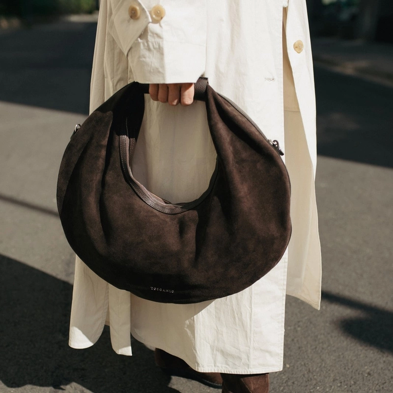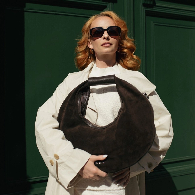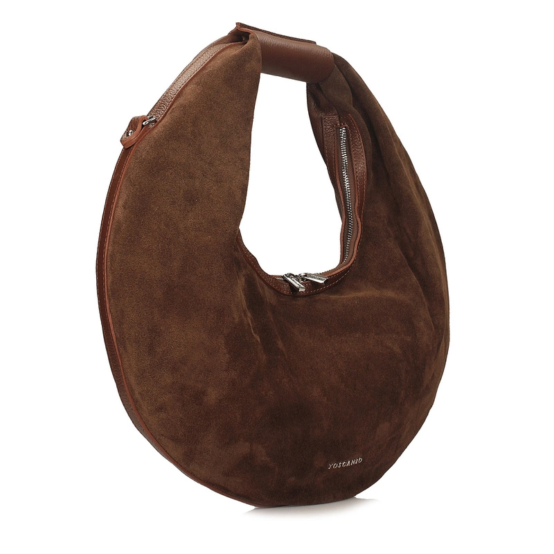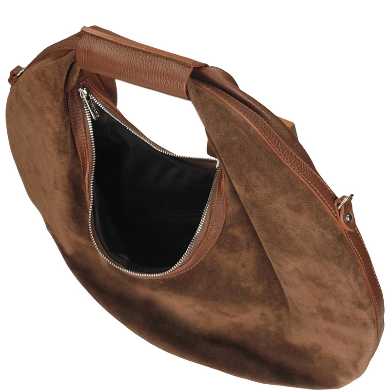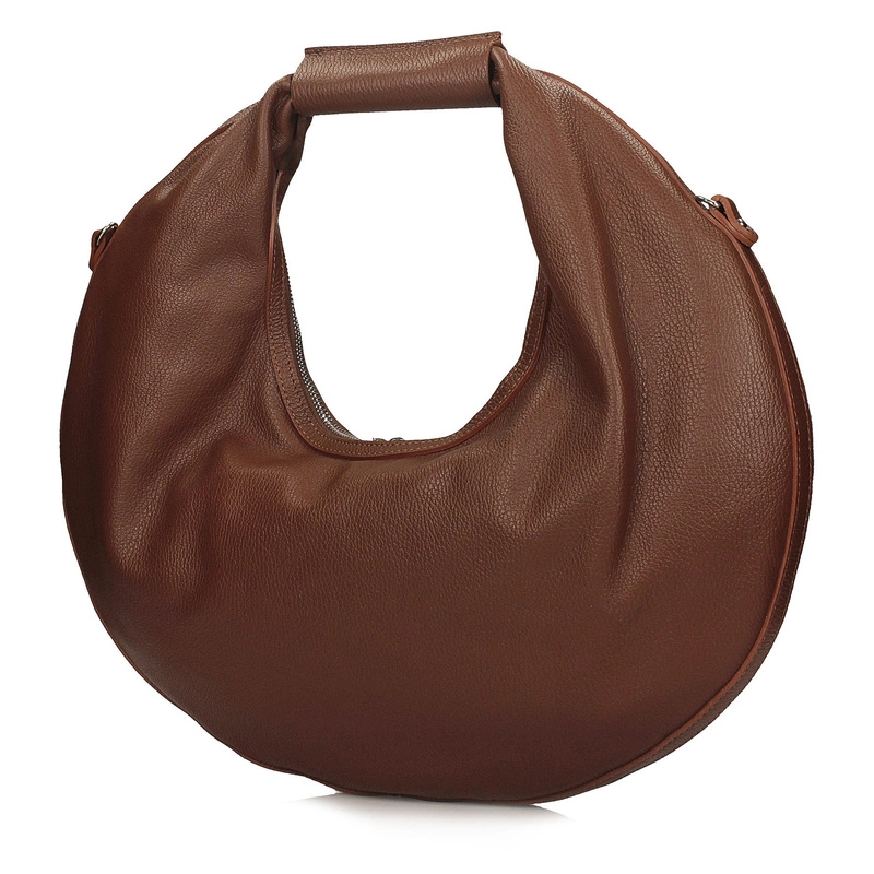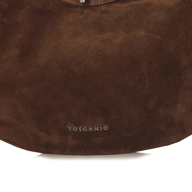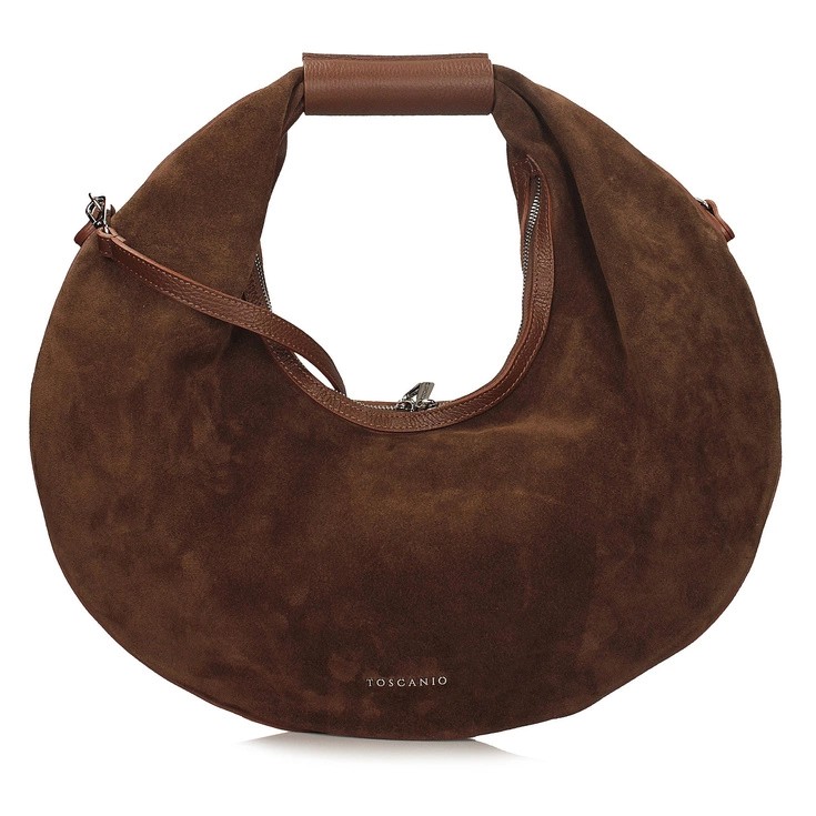 Toscanio G89 to niezwykle efektowna torebka w kształcie koła, która łączy w sobie oryginalny design, funkcjonalność i elegancję. Wykonana z połączenia dwóch rodzajów skóry – miękkiej skóry naturalnej zamszowej z przodu oraz gładkiej skóry naturalnej licowej z tyłu – zachwyca ciekawym kontrastem faktur i ponadczasowym brązowym odcieniem.
