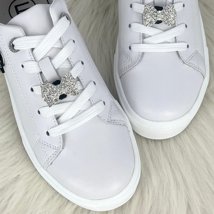 Błyszczące przypinki charms do sznurowadeł! Ozdoby pochodzące od marki TYMOTEO LOVE - nasza autorska unikalna kolekcja biżuterii do butów. Niepowtarzalne wzory będą stylowym i eleganckim dodatkiem do klasycznego obuwia. Kształt przypinki w formie błyszczącej srebrnej kokardki bogato zdobionej kombinacją kryształków. Jest to błyszczący i elegancki dodatek. Ozdoby mocowane są za pomocą otworów na sznurówkę buta, mają zamontowany specjalny okrągły uchwyt na klik, który bez problemu utrzymuje się na obuwiu.