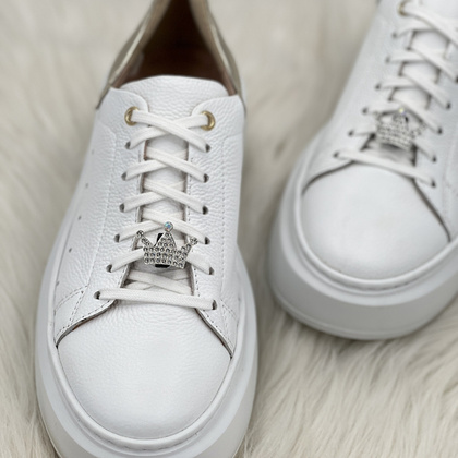 Błyszczące przypinki charms do sznurowadeł! Ozdoby pochodzące od marki TYMOTEO LOVE - nasza autorska unikalna kolekcja biżuterii do butów. Niepowtarzalne wzory będą stylowym i eleganckim dodatkiem do klasycznego obuwia. Kształt przypinki w formie błyszczącej srebrnej korony bogato zdobionej kombinacją kryształków. Jest to błyszczący i elegancki dodatek. Ozdoby mocowane są za pomocą otworów na sznurówkę buta, mają zamontowany specjalny okrągły uchwyt na klik, który bez problemu utrzymuje się na obuwiu.