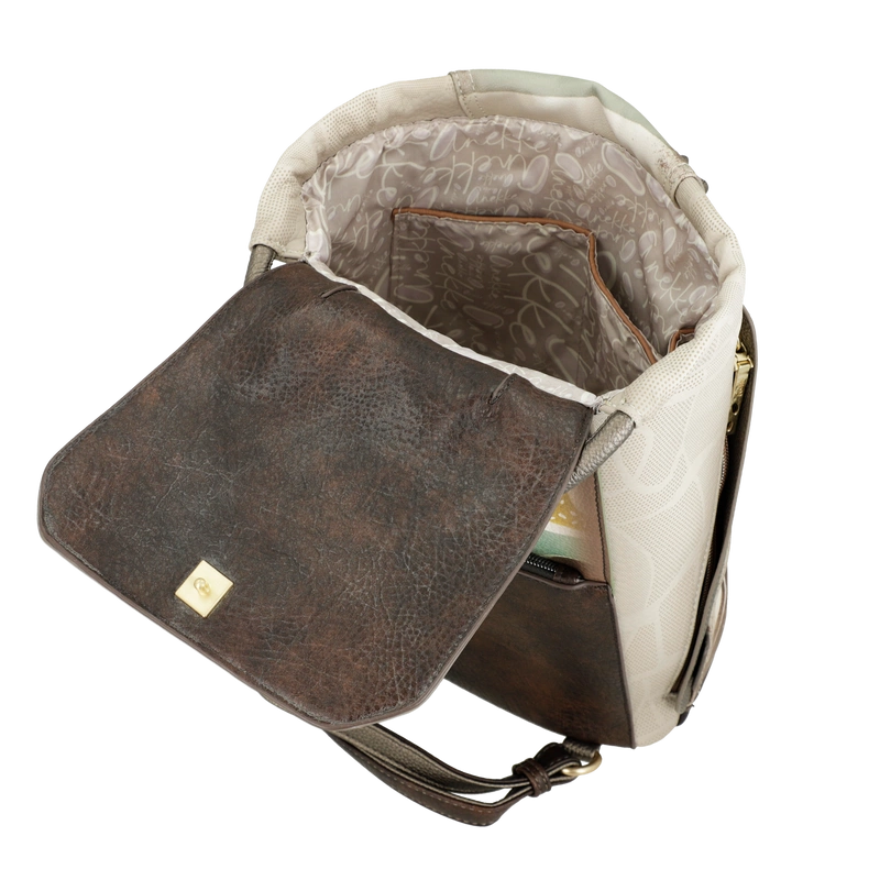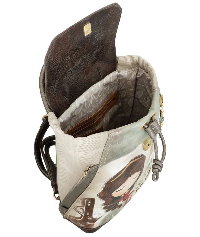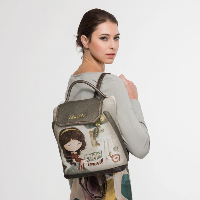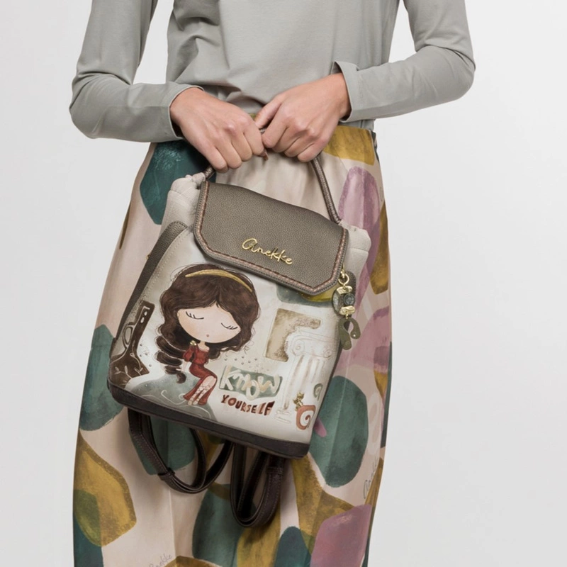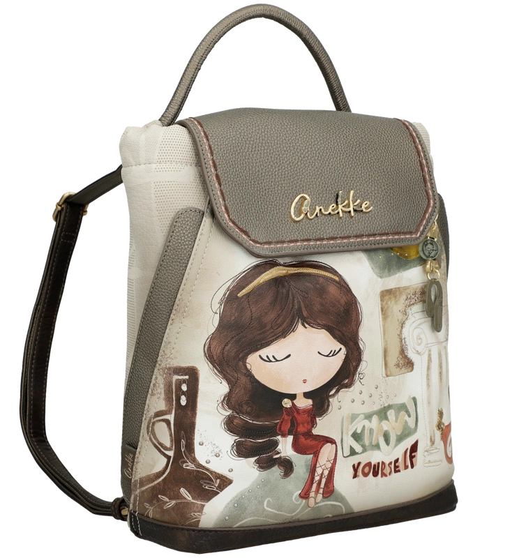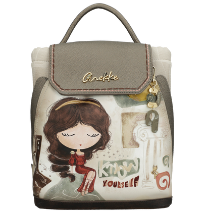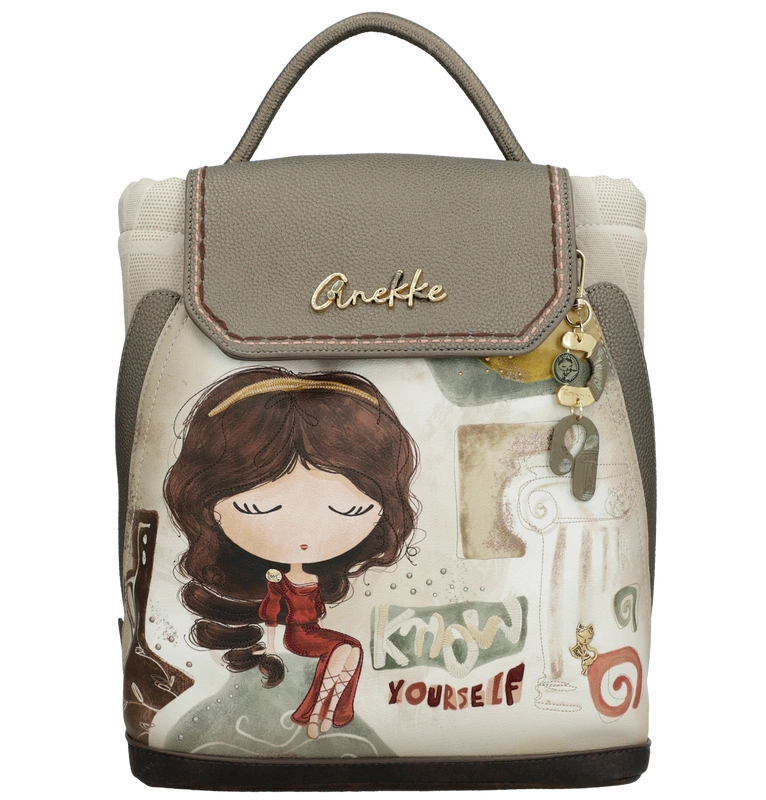 Front plecaka zdobi grafika Anekke w antycznej scenerii – otoczona greckimi kolumnami i złotymi refleksami słońca. Delikatne hafty, metaliczne logo i charakterystyczna zawieszka w kształcie liścia laurowego dodają mu artystycznego charakteru. Jasna paleta barw – błękity, beże i złote akcenty – nawiązuje do krajobrazów śródziemnomorskich, emanując spokojem i kobiecą delikatnością.