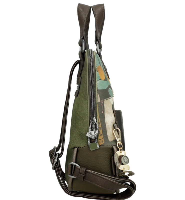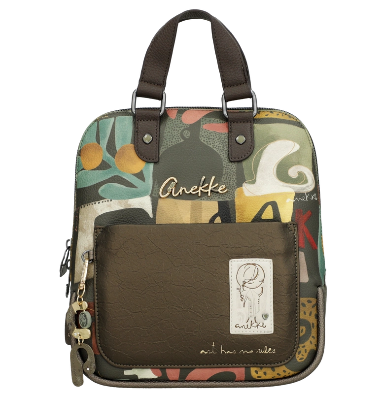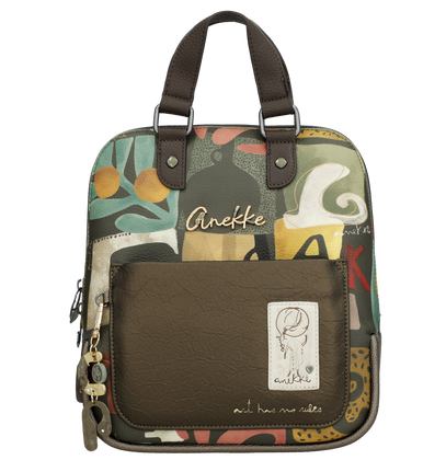 Front plecaka zdobi grafika Anekke inspirowana grecką ceramiką – utrzymana w odcieniach beżu, błękitu i ochry, z delikatnymi haftami oraz złocistymi refleksami. Zawieszka w kształcie amfory symbolizuje równowagę i kobiecą siłę, podkreślając artystyczny charakter kolekcji. To model, który urzeka detalami i ponadczasowym designem.