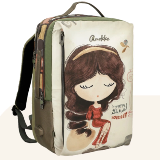 Front plecaka zdobi grafika Anekke w greckim klimacie – utrzymana w odcieniach beżu, błękitu i złota, z subtelnymi haftami i metalicznymi akcentami. Charakterystyczne detale, logotyp i zawieszka z motywem podróży podkreślają artystyczny styl marki. To wyjątkowy plecak, który łączy w sobie ducha przygody i elegancji.