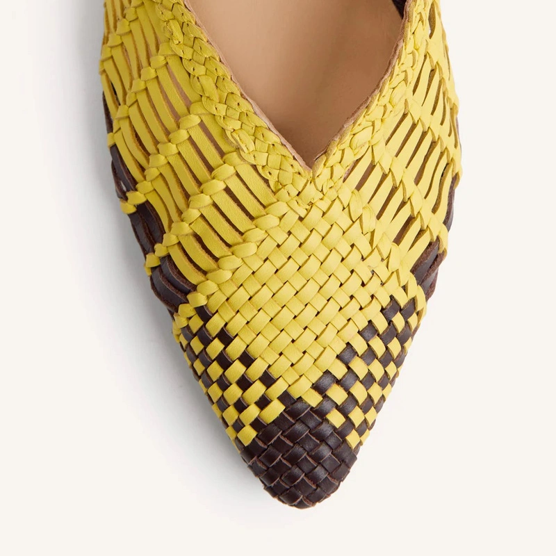 Model został wykonany z wysokiej jakości skóry naturalnej, ręcznie plecionej w efektowny wzór. Otwarta pięta z regulowanym paskiem typu slingback zapewnia dobre dopasowanie oraz komfort noszenia, jednocześnie nadając butom lekkości i subtelnej elegancji.