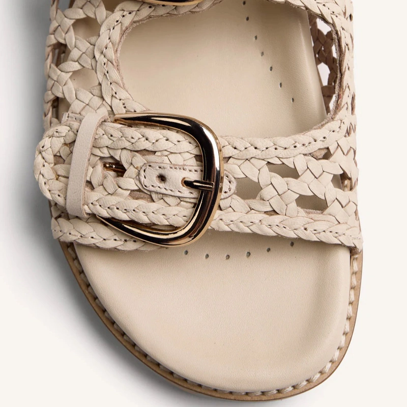 Cholewka została wykonana z wysokiej jakości skóry naturalnej, ręcznie plecionej w efektowny, rzemieślniczy wzór. Dwie regulowane klamry pozwalają na idealne dopasowanie do stopy, zapewniając stabilność i komfort noszenia przez cały dzień.