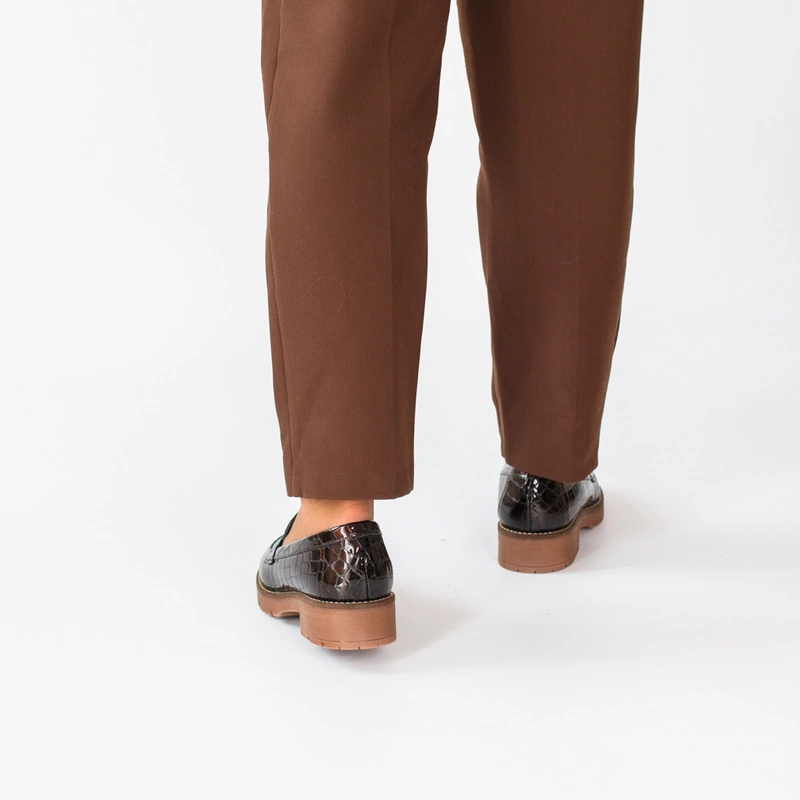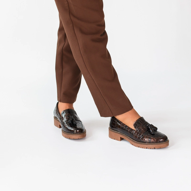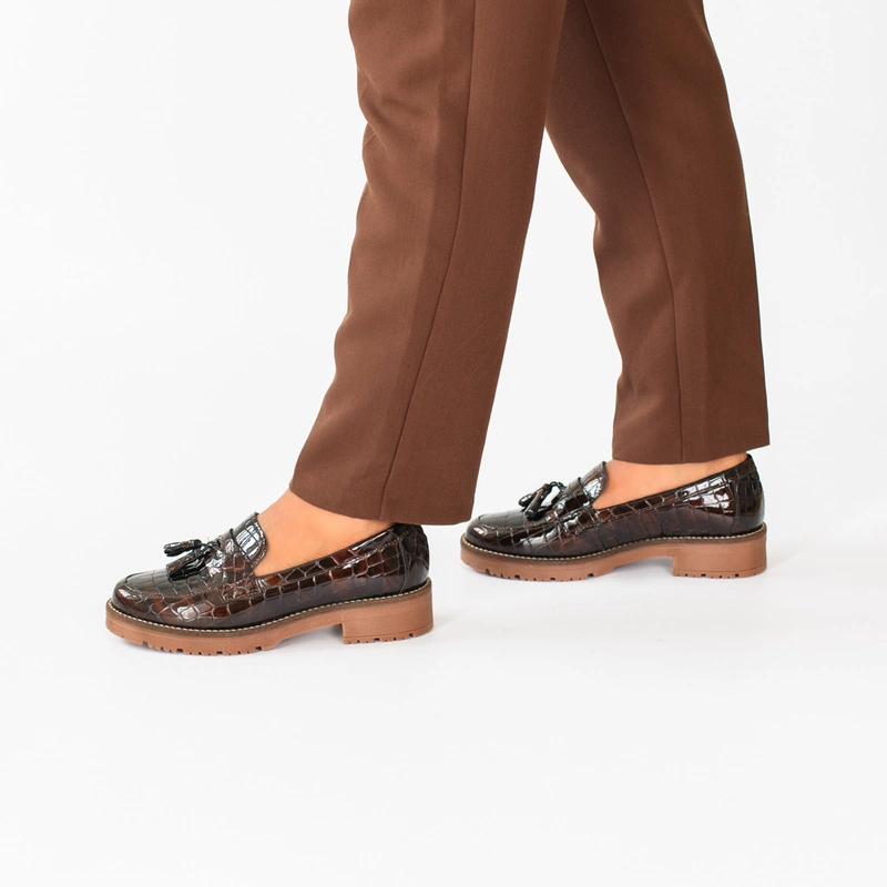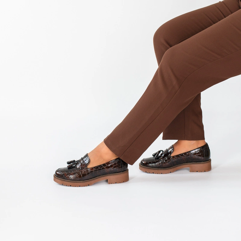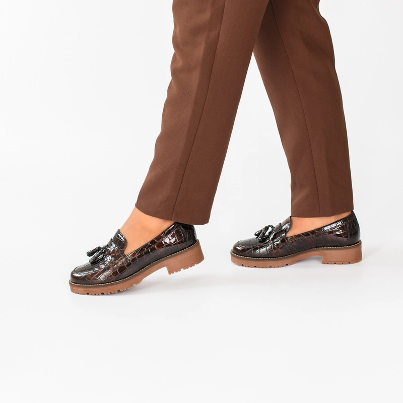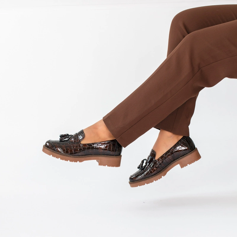 Brązowe półbuty PITILLOS 10770 to propozycja dla kobiet, które cenią połączenie ponadczasowej elegancji z codziennym komfortem. Wykonane ze skóry naturalnej lakierowanej, zachwycają subtelnym połyskiem oraz tłoczeniem inspirowanym skórą krokodyla. Stabilna, podniesiona podeszwa i wygodny obcas o wysokości 3 cm dodają sylwetce lekkości i zapewniają pewny, sprężysty krok. Dzięki wyjmowanej wkładce oraz dopasowanej konstrukcji, model ten doskonale sprawdzi się również u osób z nieco szerszymi stopami.