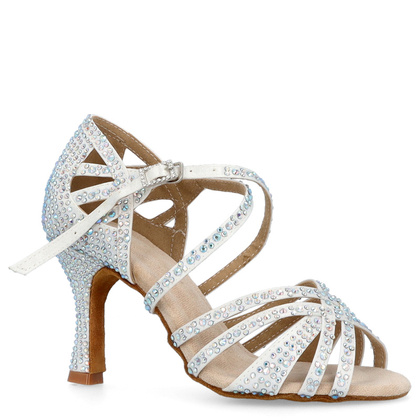 Szukasz wygodnych, a jednocześnie efektownych butów na taneczną imprezę? Może jesteś na etapie poszukiwania idealnych butów ślubnych? Sandałki z najnowszej kolekcji ślubnej TYMOTEO LOVE to profesjonalne taneczne buty! Zgrabne sandałki z miękką elastyczną podeszwą wykończoną od spodu skórą welurową doskonale łączą wygodę i efektowny wygląd. Cholewkę buta opracowano tak, by jak najlepiej trzymała stopę, a paseczki wyłożone opalizującymi cyrkoniami gwarantują błysk na parkiecie. Odkryty przód i zakryta pięta połączone ze skrzyżowanymi paskami to wzór charakterystyczny dla obuwia tanecznego. Buty są wyjątkowo wygodne i doskonale sprawdzą się podczas wielogodzinnej zabawy na parkiecie lub treningach tańca latynoskiego. W sandałkach zastosowano sprawdzony obcas o wysokości 8,5 cm, szpilka latynoska typu flare dodaje sylwetce lekkości, a przy tym jest bardzo stabilna. Paski trzymające stopę ułożone są krzyżowo, dzięki temu but nie skraca nogi, a wręcz przeciwnie, podkreśla jej zgrabną linię i dodaje butom wdzięku. Wnętrze buta także zostało wykonane z miękkiego materiału, zapewnia więc doskonałą cyrkulację powietrza.