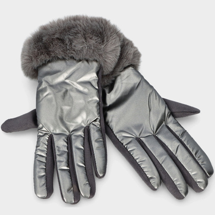Rękawiczki damskie z kolekcji TYMOTEO LOVE ogrzeją twoje dłonie w najchłodniejsze dni. Ciepłe i niesłychanie miękkie rękawiczki damskie z możliwością obsługi ekranów dotykowych znakomicie sprawdzą się w czasie zimy i jesieni. Rękawiczki wykonane z błyszczącej tkaniny w odcieniach srebra i szarości, ozdobione puszystym milutkim futerkiem. Wewnętrzna strona wykończona bawełnianą ocieploną tkaniną.