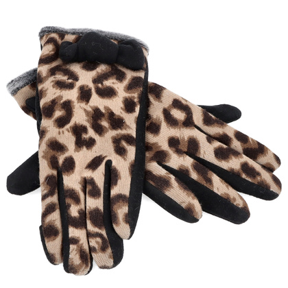 Rękawiczki damskie z kolekcji TYMOTEO LOVE ogrzeją twoje dłonie w najchłodniejsze dni. Ciepłe i niesłychanie miękkie rękawiczki damskie z możliwością obsługi ekranów dotykowych znakomicie sprawdzą się w czasie zimy i jesieni. Rękawiczki posiadają otwór na palec wskazujący, dzięki czemu można obsługiwać telefon i jednocześnie ogrzewać dłonie rękawiczkami. Rękawiczki wykonane z tkaniny z domieszką wełny w modny wzór panterki. Wewnętrzna strona wykończona bardzo przyjemną miękką tkaniną. Model z uroczą kokardką na nadgarstku, doskonale dopasowuje się do kształtu dłoni i zapewnia ochronę przed chłodem.
