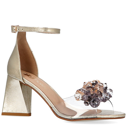 Szukasz eleganckich sandałków, które powalają na kolana swoim nietuzinkowym wyglądem ? Silikonowe sandałki na słupku to model stworzony właśnie dla Ciebie! Sandały wykonane zostały z wysokiej jakości skóry naturalnej w pięknym, złotym odcieniu. Szeroki, silikonowy pasek przyozdobiony mieniącymi się kryształami, doskonale układa się na skórze, a co najistotniejsze nie pozwala na to, by stopa przesuwała się niżej. Solidne zapięcie wokół kostki zapewnia stabilność i finalne dopasowanie do kształtu nogi. Designerski 8-centymetrowy obcas nadaje obuwiu niezaprzeczalnego charakteru.