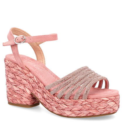 Cenisz sobie komfort oraz wygodę lecz niepowtarzalność jest dla Ciebie równie ważna? Jeśli tak to pochodzące z naszej najnowszej kolekcji sandałki na koturnie LEJADE - będą idealne w sam raz dla Ciebie! Sandały zostały wykonane z najwyższej skóry ekologicznej w różowym odcieniu. Paski na przodzie doskonale podtrzymujący stopę - przyozdobione zostały nietuzinkowymi cyrkoniami w złotym kolorze, które dodają wyjątkowo beztroskiego i oryginalnego charakteru. Solidne zapięcie wokół kostki z wykorzystaniem uniwersalnej i ponadczasowej sprzączki zapewnia doskonałą stabilność oraz sprawia, że bez trudu dopasujesz buty do szerokości stopy. Stabilny 9,5 - centymetrowy obcas typu koturn dodaje kilku centymetrów wzrostu, optycznie wysmukla i wydłuża sylwetkę oraz dodaje jej niepowtarzalnej lekkości i kobiecego wdzięku.