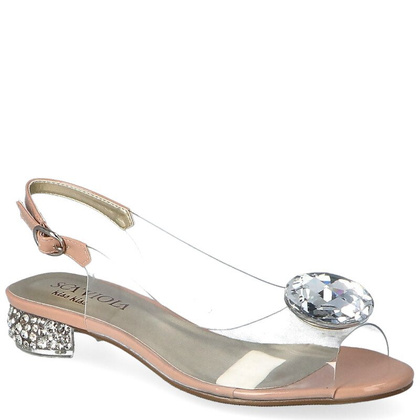 Wygodne sandały damskie na płaskim obcasie pochodzące z kolekcji renomowanego producenta- firmę SCAVIOLA. Buty wyprodukowane w Polsce, wzorowane na modzie włoskiej. Sandały pięknie prezentują się na stopach, o efekcie całości decyduje wierzchnia część cholewki, która została wykonana z przezroczystego, wysokogatunkowego silikonu, który z racji swojej miękkości bardzo dobrze dopasowuje się do stopy. Model ten posiada bardzo dobrą wentylację, co znacząco podnosi komfort użytkowania nawet w bardzo upalne dni. Fason ten podkreślają detale - piękna aplikacja w postaci ozdobnego kamienia. Sandałki posiadają niski obcas - 3cm, zdobiony pięknymi kamieniami. Model idealny na ślub (również swój własny), wesele oraz inne imprezy. W tych butach możesz komfortowo spędzić nawet 24 godziny, jest to silikon, który nie odparza.