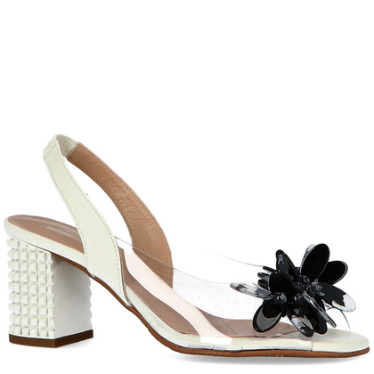 Białe silikonowe sandałki wykonano z najwyższą starannością i dbałością o detale. Do ich produkcji wykorzystano materiały najwyższej jakości. Do produkcji wewnętrznej części obuwia oraz pasków podtrzymujących stopę zastosowano najwyższej jakości skórę naturalną. Przednią część cholewki wykonano z wysokogatunkowego, transparentnego silikonu — charakteryzującego się bardzo dużą elastycznością i miękkością.  Całość przyozdobiono nietuzinkową i oryginalną aplikacją z czarnych kamyczków, które przepleciono z koralikami stylizowanymi w drapieżny wzór leoparda.