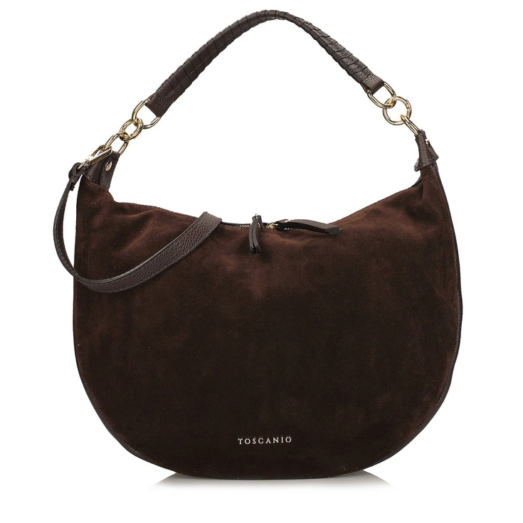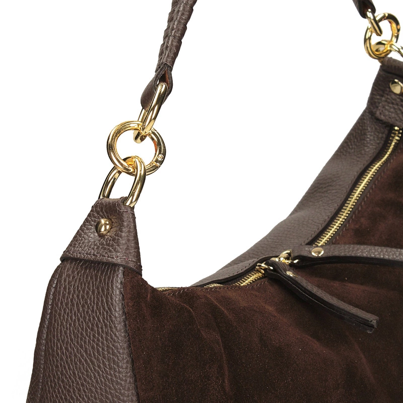 Torebka Toscanio F217 łączy klasykę z nutą nowoczesności. Przód wykonany z delikatnego zamszu podkreśla jej miękki, kobiecy charakter, natomiast tył i boki z gładkiej skóry licowej nadają jej trwałości i struktury. Złote okucia w połączeniu z ciemnym brązem prezentują się wyjątkowo elegancko. To model, który świetnie wpisuje się w jesienne i zimowe stylizacje, ale równie dobrze wygląda przez cały rok.