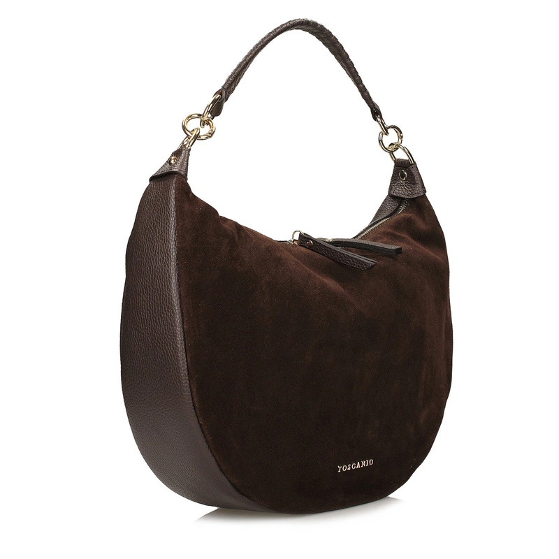 Skórzana torebka Toscanio F217 w kolorze ciemnego brązu to propozycja dla kobiet, które cenią styl, jakość i ponadczasowy charakter. Wykonana z połączenia naturalnej skóry licowej i miękkiego zamszu, zachwyca wyjątkową fakturą i głębią barwy. Jej półokrągły fason typu hobo jest zarówno elegancki, jak i wygodny w codziennym użytkowaniu, sprawiając, że torebka staje się nieodłącznym elementem kobiecej garderoby.