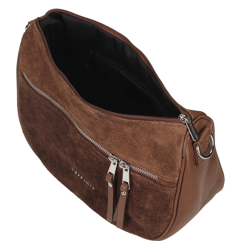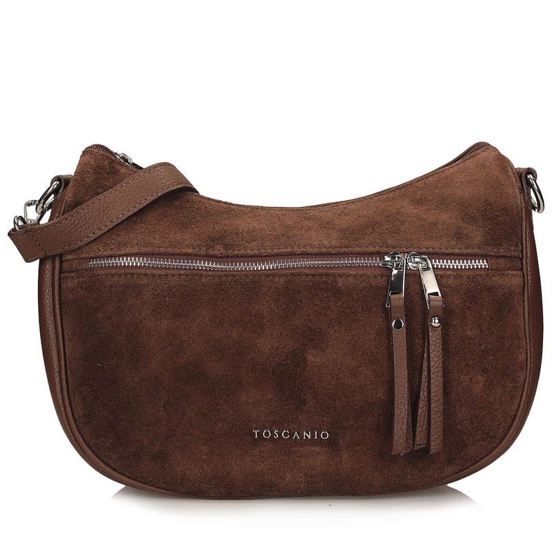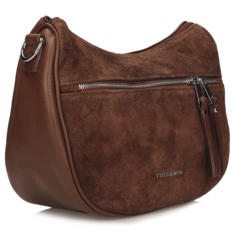Toscanio G139 w odcieniu eleganckiego brązu to listonoszka, która doskonale łączy ponadczasową klasykę z nutą współczesnego stylu. Wykonana z naturalnej skóry licowej w połączeniu z przednim panelem z miękkiej skóry zamszowej, prezentuje się niezwykle stylowo i szlachetnie. Jej uniwersalny kolor i przemyślany design sprawiają, że to idealny model na co dzień – do pracy, na spacer lub spotkanie z przyjaciółmi.