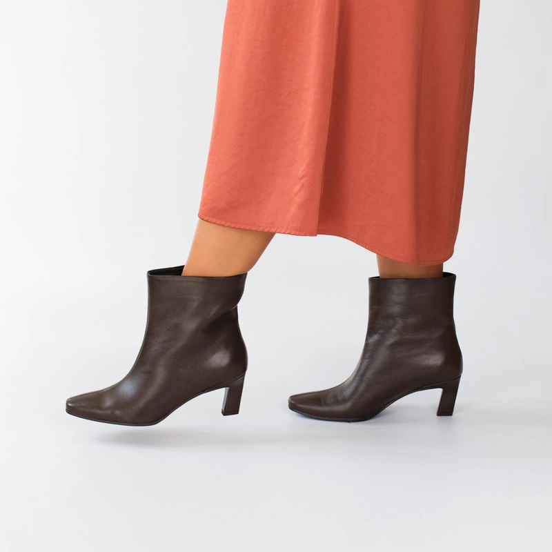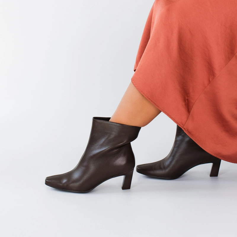 Minimalistyczny fason bez zamka to prawdziwa esencja nowoczesnego designu. Buty mają wsuwany krój, co czyni je łatwymi do założenia, a jednocześnie zachowują jednolitą, gładką linię. Smukły, stabilny obcas o nowoczesnym kształcie dodaje centymetrów, nie odbierając komfortu. Brązowy kolor to doskonała alternatywa dla klasycznej czerni – cieplejszy, bardziej naturalny i idealny na chłodniejsze miesiące.