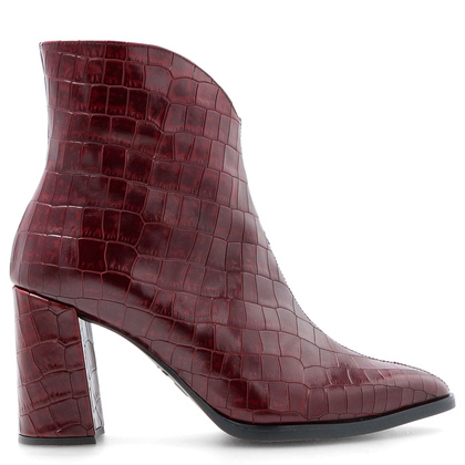 Cholewka została wykonana z wysokogatunkowej skóry naturalnej, co zapewnia nie tylko trwałość, ale też doskonałe dopasowanie do stopy. Czerwono-bordowa tonacja sprawia, że botki stanowią efektowny element jesienno-zimowej garderoby. Uwagę zwraca tłoczony wzór na pięcie, inspirowany motywem zwierzęcym – subtelny, a zarazem intrygujący.
